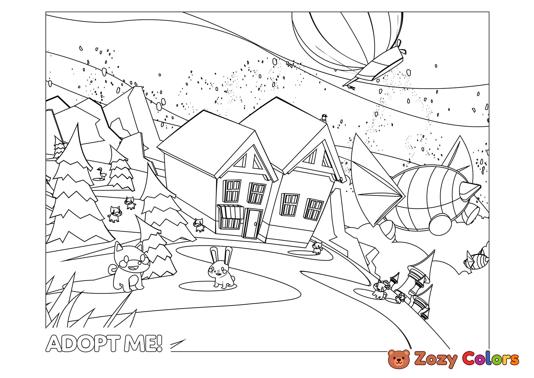 Adopt me Roblox House in snow. Coloring page to print or download and color for your kids.