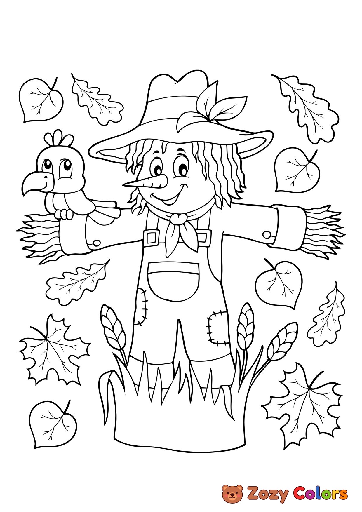 Autumn scarecrow with a crow. Coloring page to print or download and color for your kids.