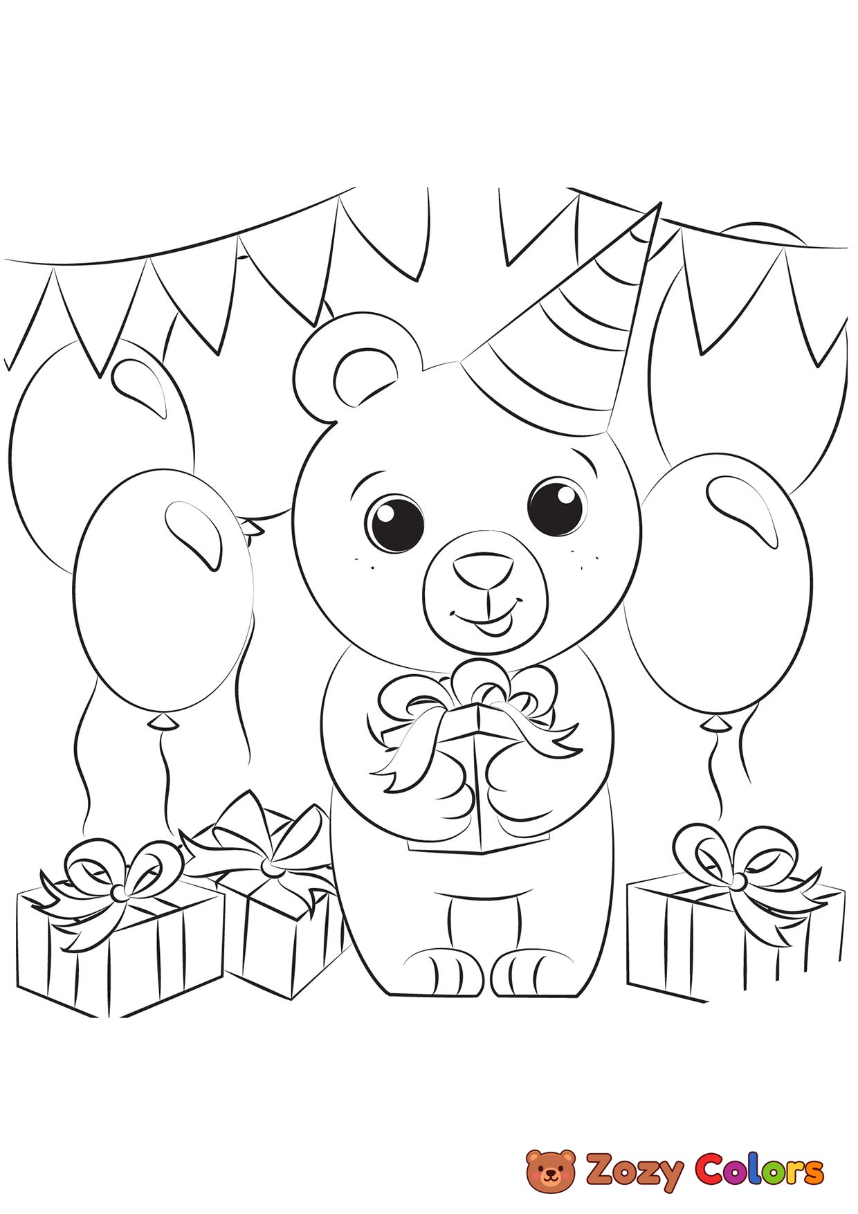 Birthday Bear. Coloring page to print or download and color for your kids.