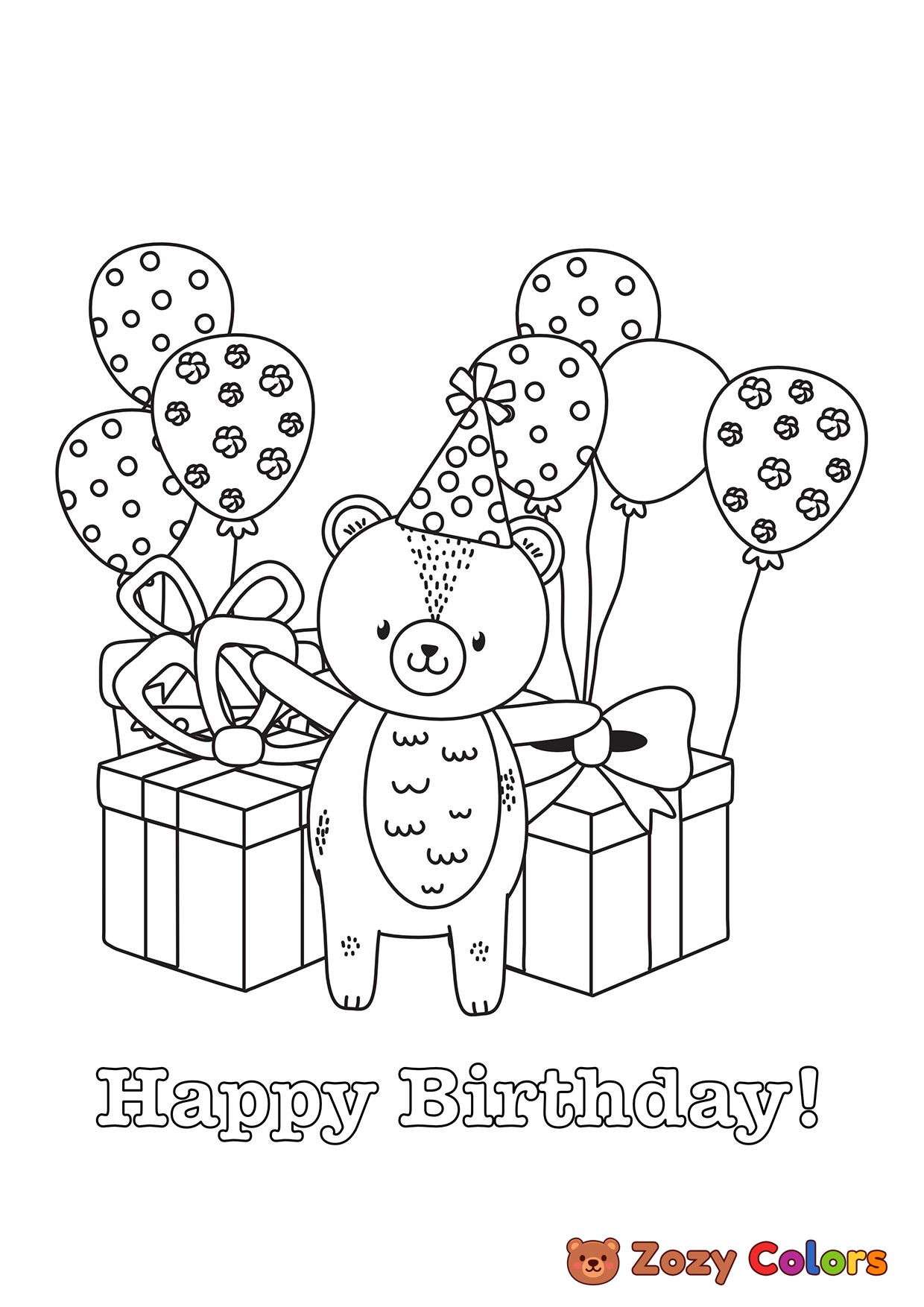 Birthday Bear with balloons. Coloring page to print or download and color for your kids.
