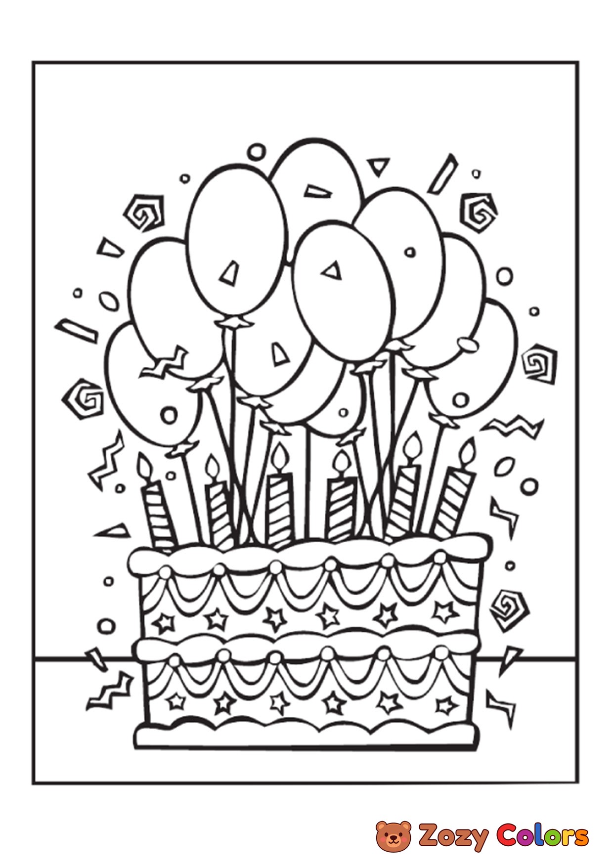 Birthday cake with ballons. Coloring page to print or download and color for your kids.