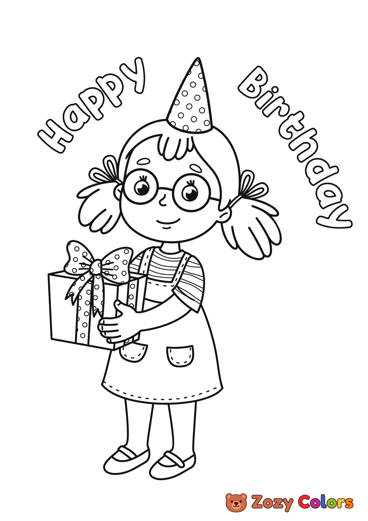 Birthday girl with a present. Coloring page to print or download and color for your kids.