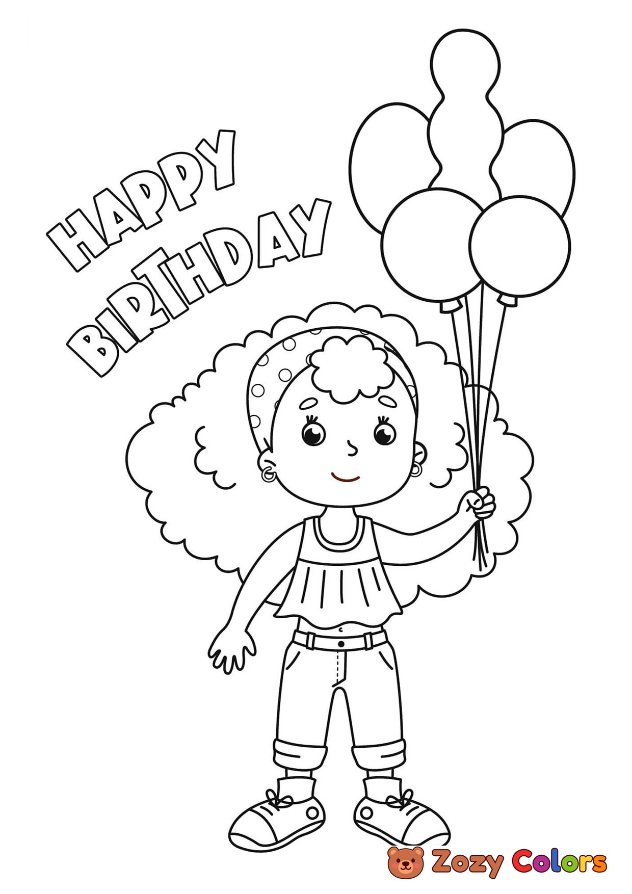 Birthday girl with balloons. Coloring page to print or download and color for your kids.