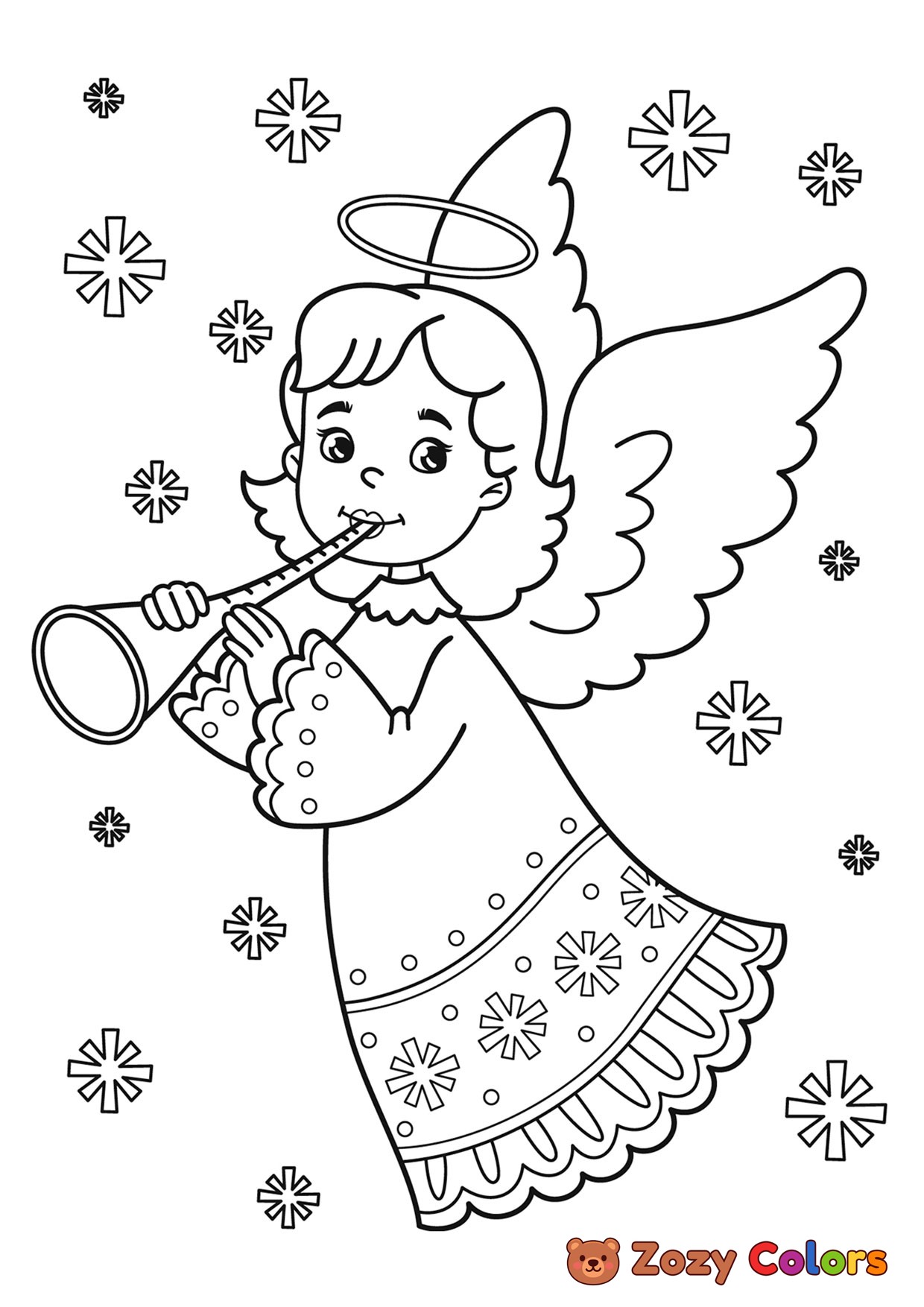 Christmas angel playing flute. Coloring page to print or download and color for your kids.