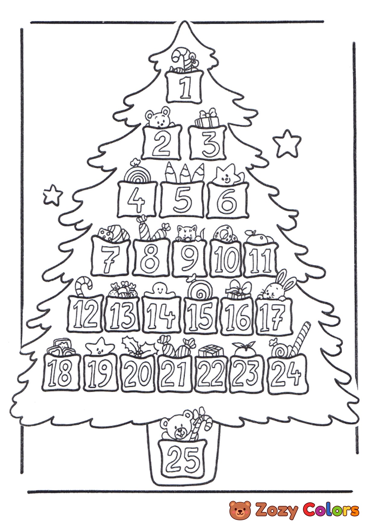 Christmas tree advent calendar. Coloring page to print or download and color for your kids.