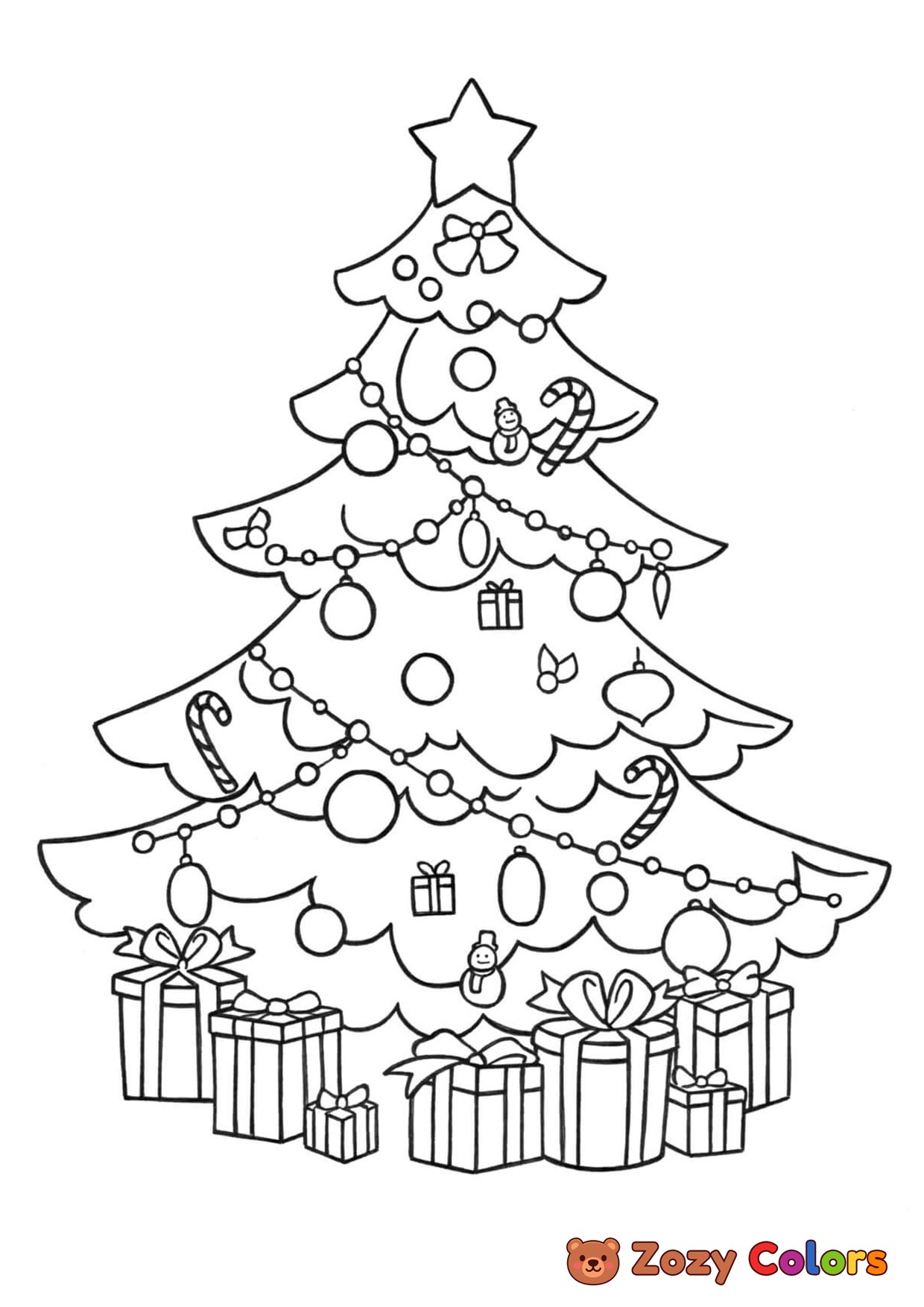 Christmas tree with ornaments. Coloring page to print or download and color for your kids.
