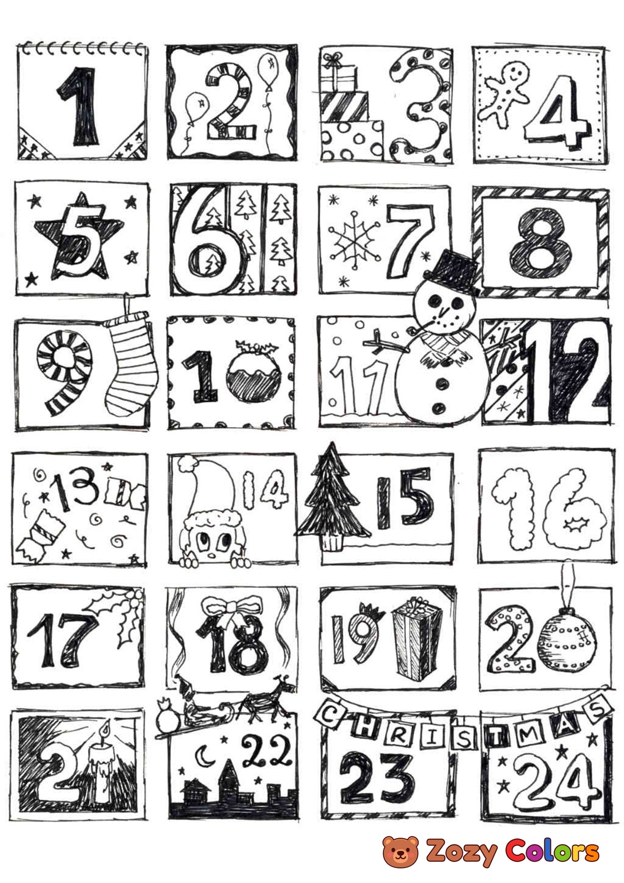 Days of Christmas advent calendar. Coloring page to print or download and color for your kids.