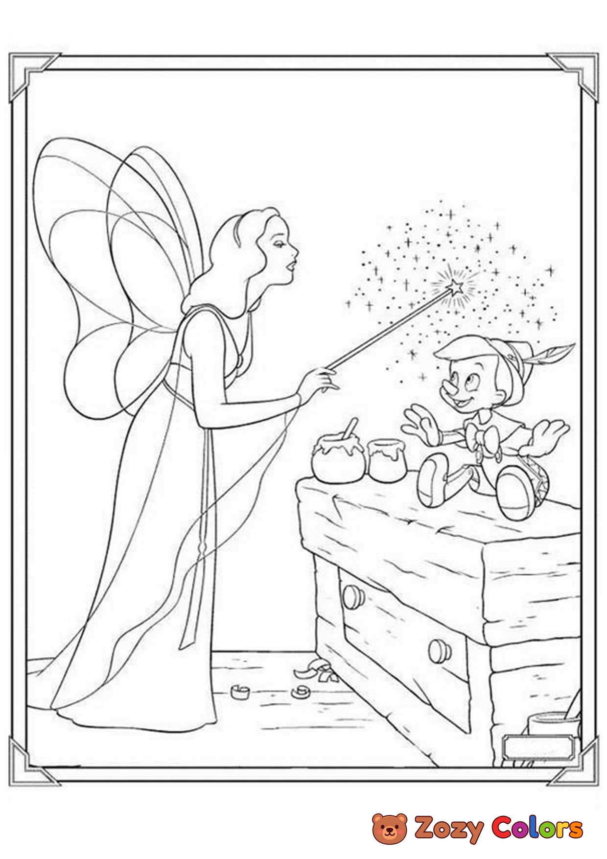 Fairie making Pinocchio into boy. Coloring page to print or download and color for your kids.