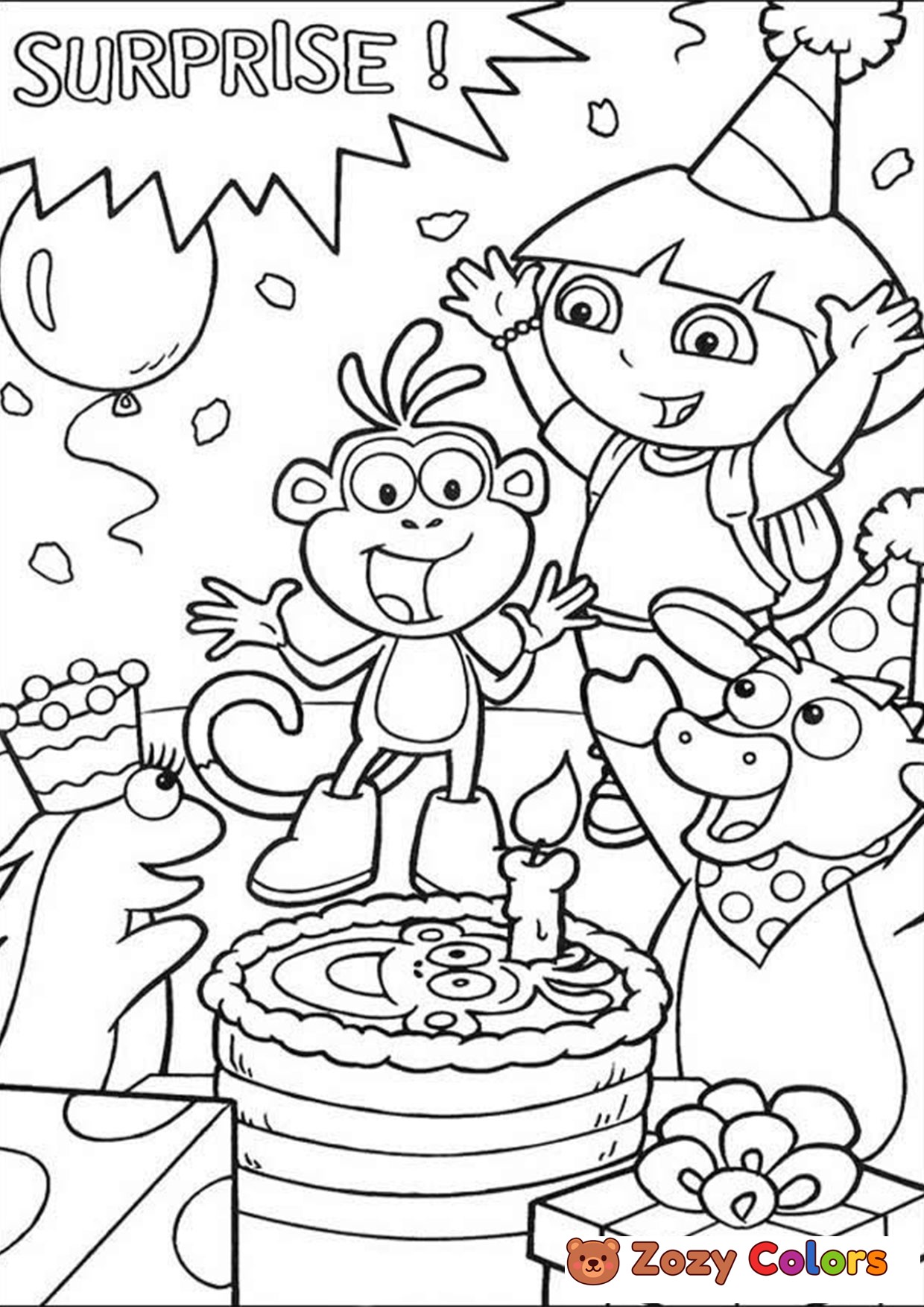 Finding Dora birthday party. Coloring page to print or download and color for your kids.
