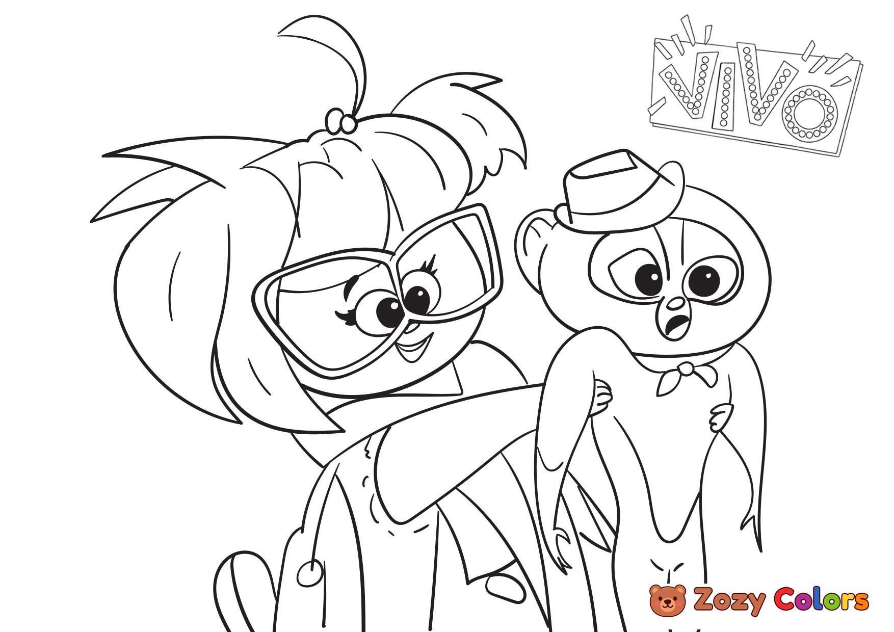 Gaby holding Vivo. Coloring page to print or download and color for your kids.