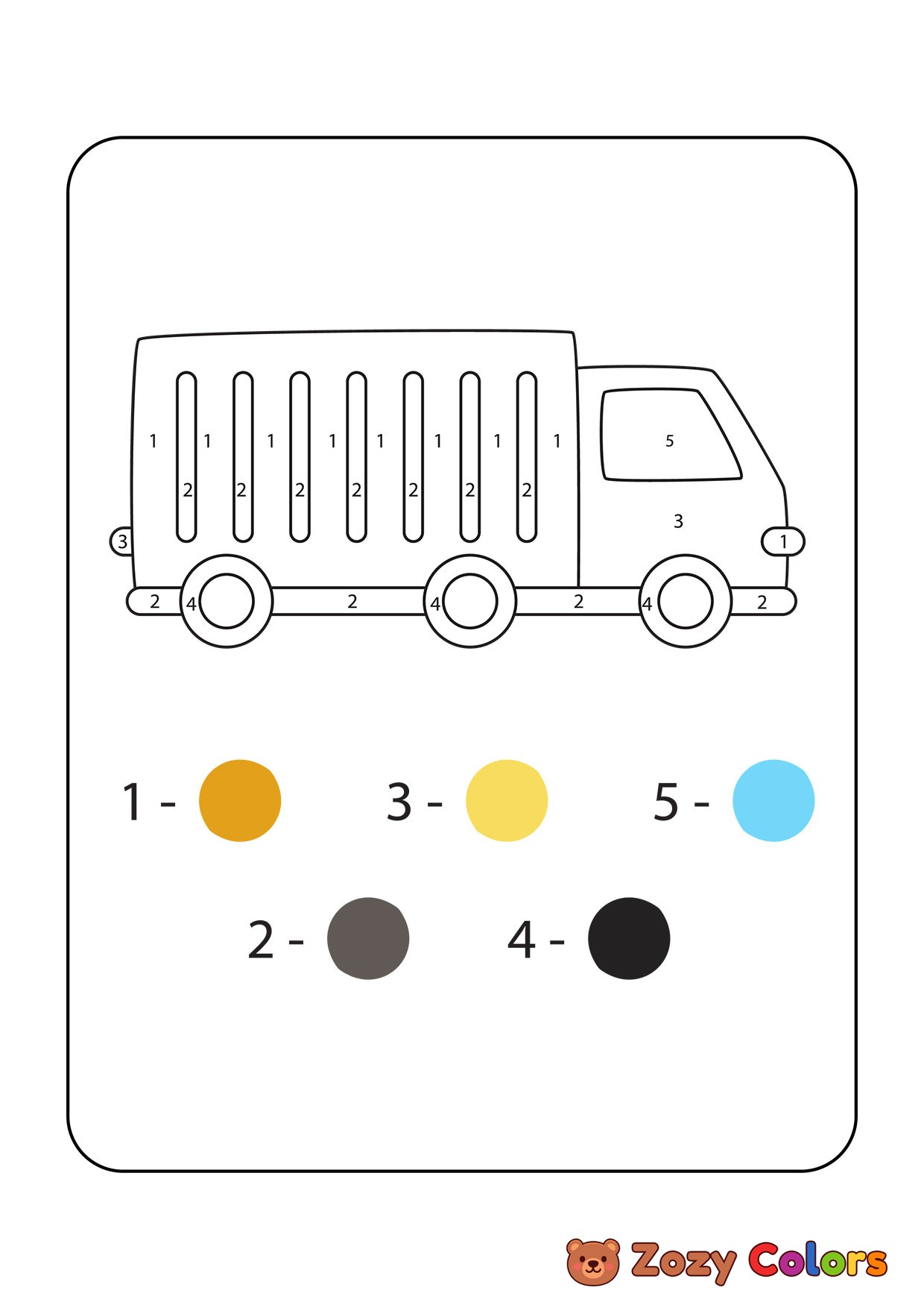 Garbage truck color by numbers. Coloring page to print or download and color for your kids.
