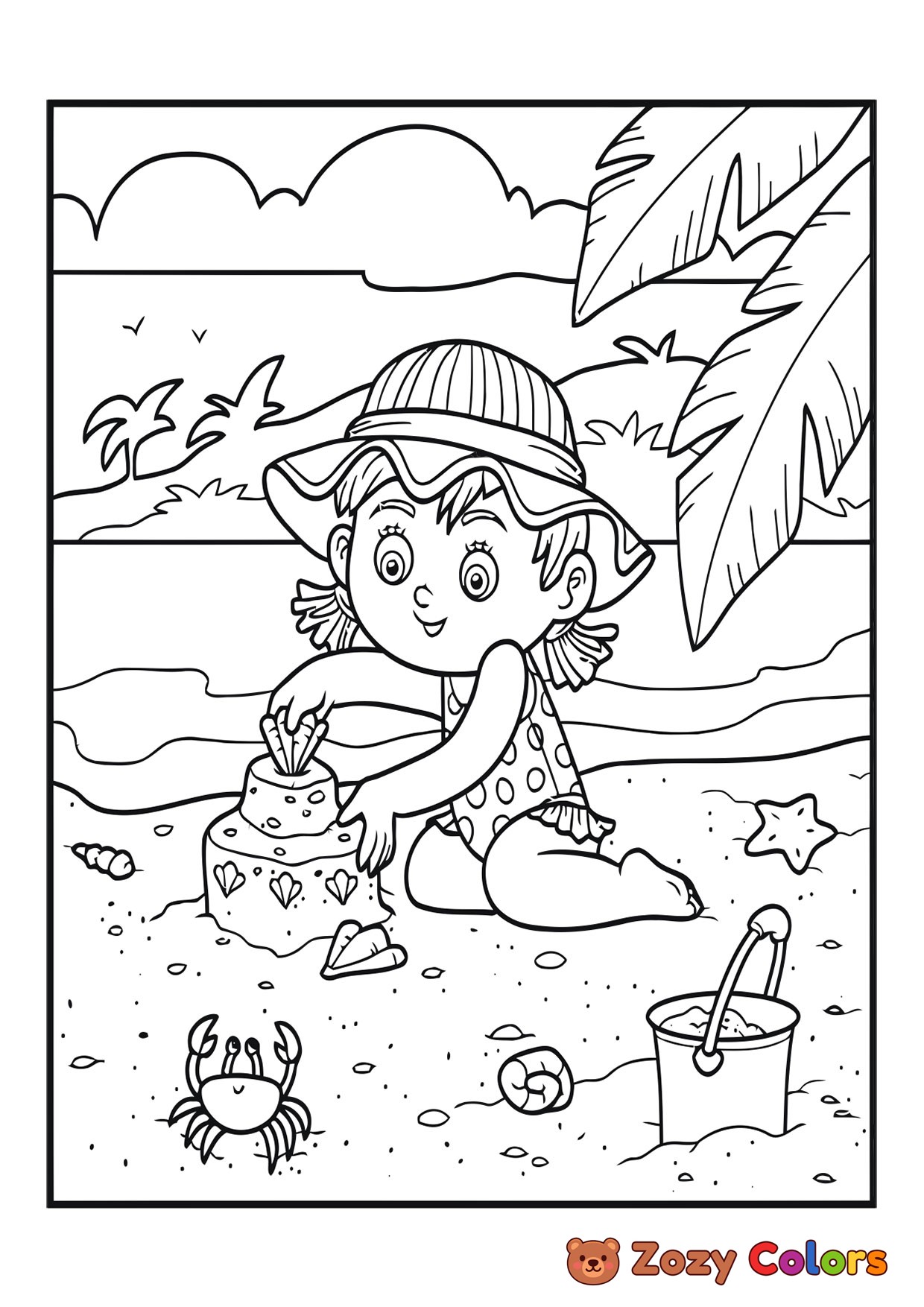 Girl building sand castles. Coloring page to print or download and color for your kids.