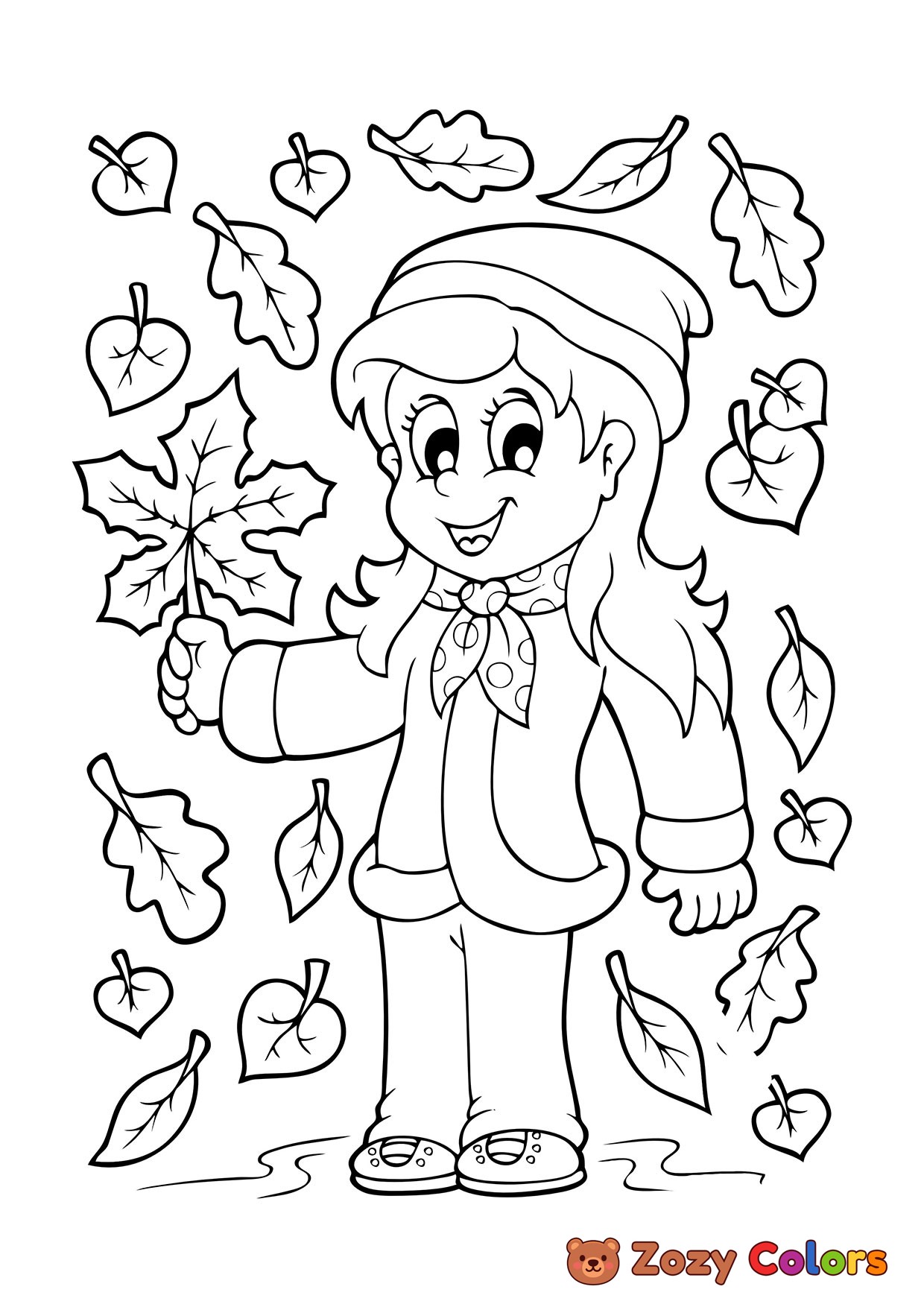 Girl with fall leaves. Coloring page to print or download and color for your kids.