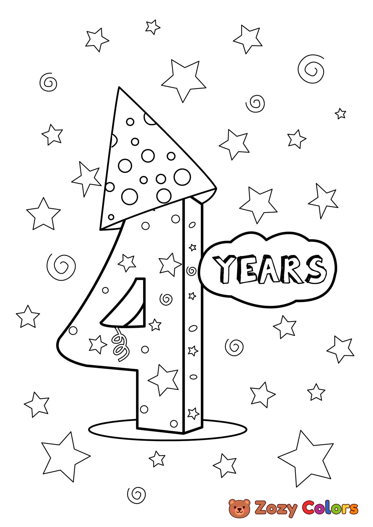 Happy 4th birthday. Coloring page to print or download and color for your kids.