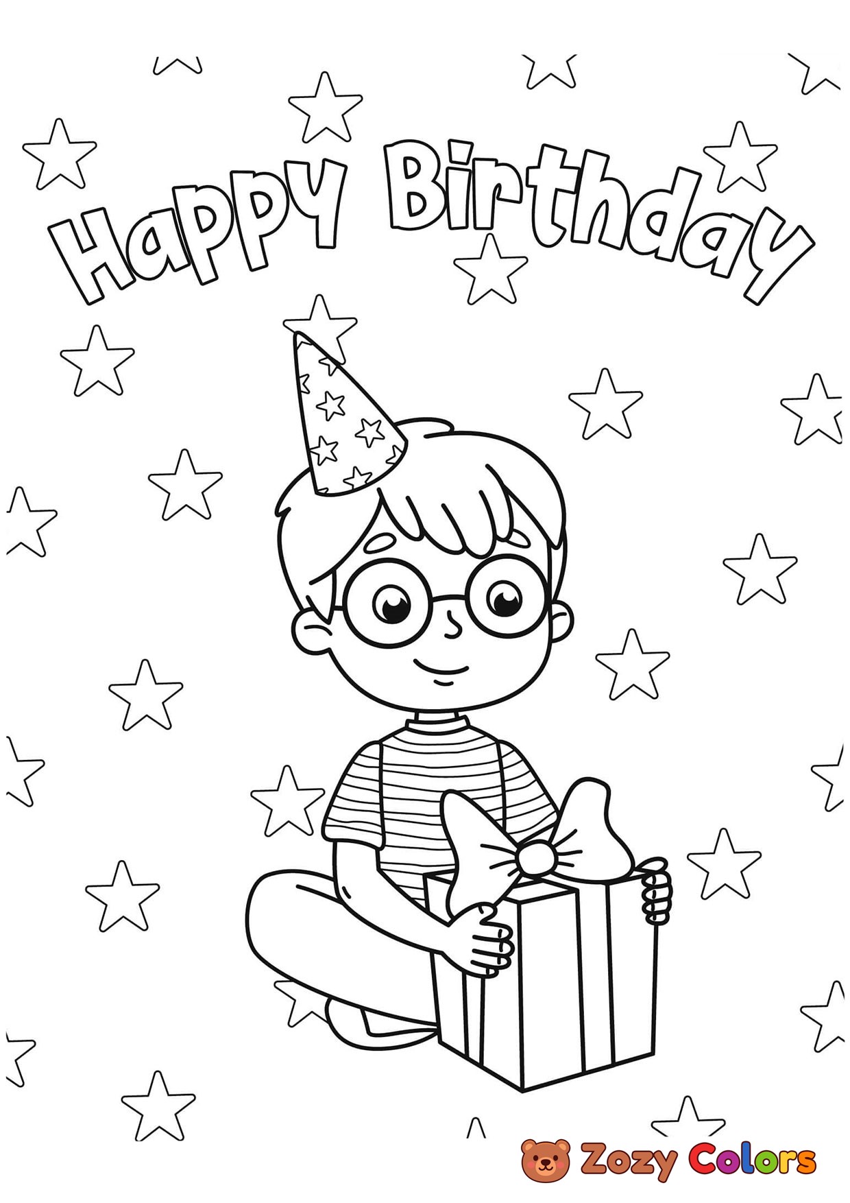 Happy Birthday boy with present. Coloring page to print or download and color for your kids.