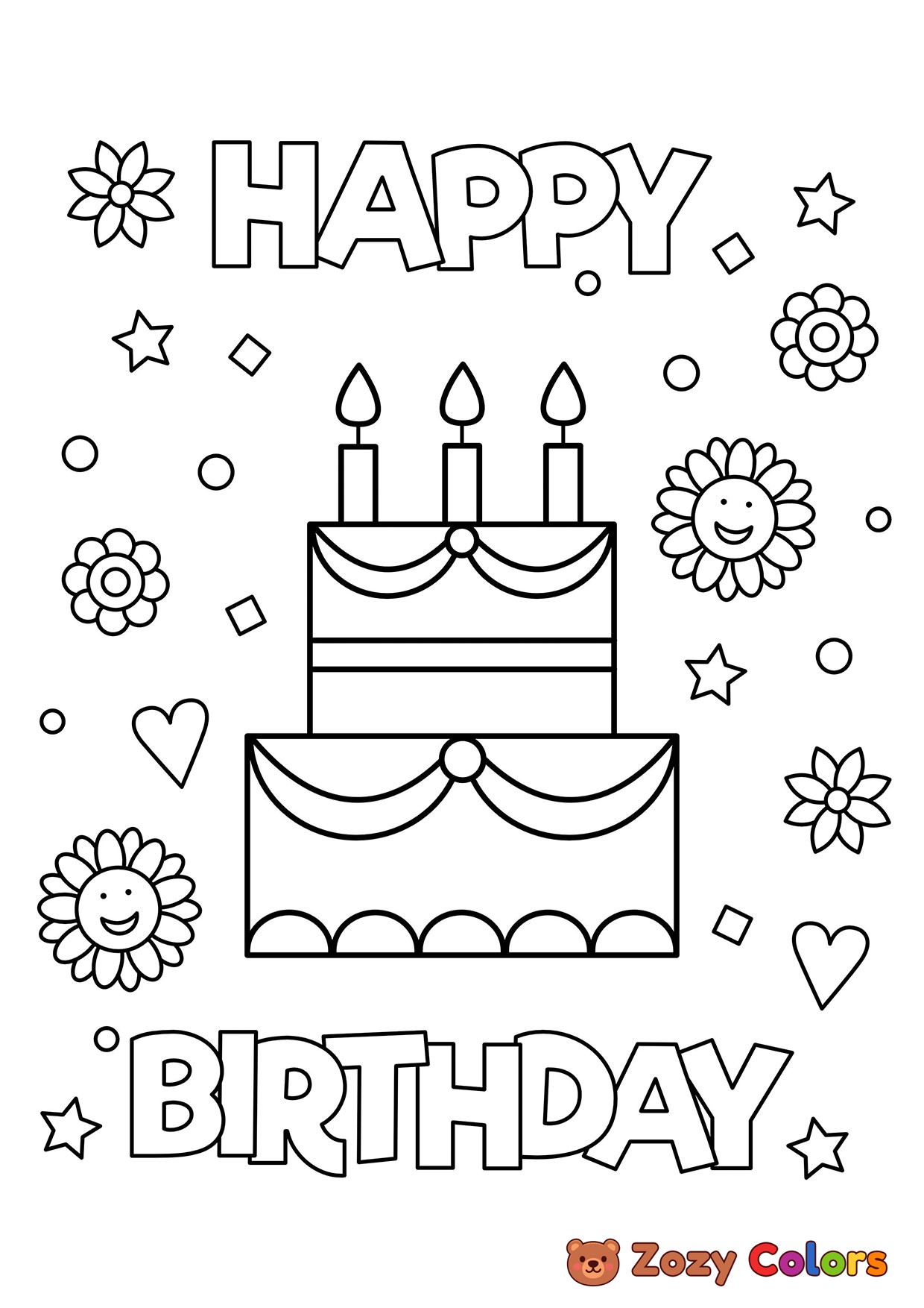 Happy birthday cake with flowers. Coloring page to print or download and color for your kids.