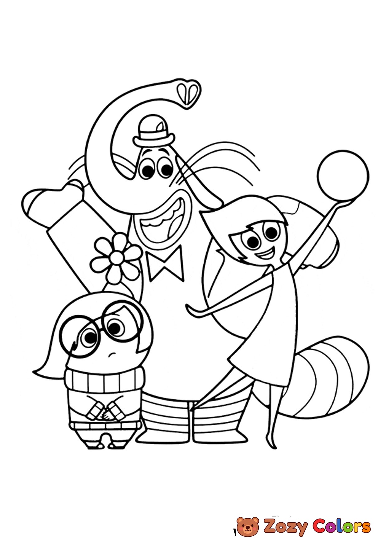 Inside Out Joy Sadness and Bing Bong having fun. Coloring page to print or download and color for kids.
