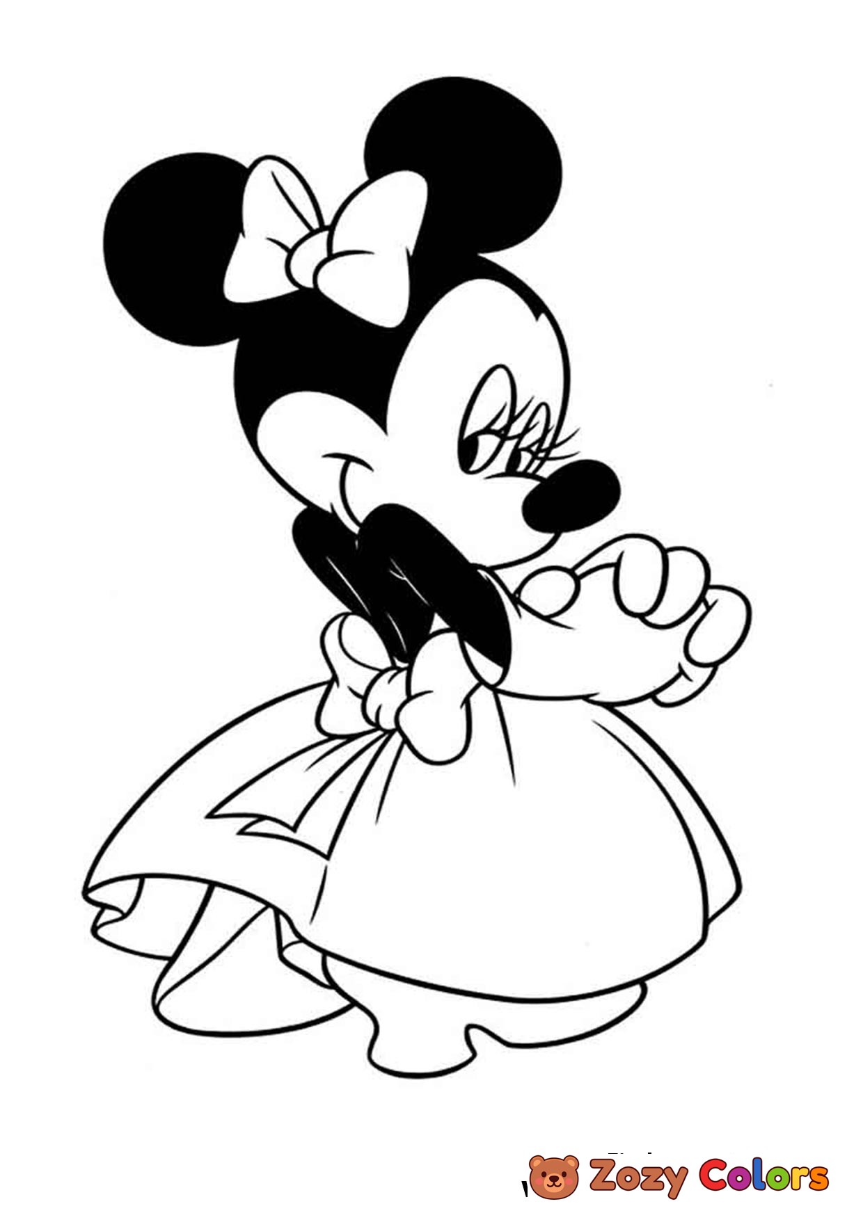 Minnie Mouse in dress looking cute. Coloring page to print or download and color.