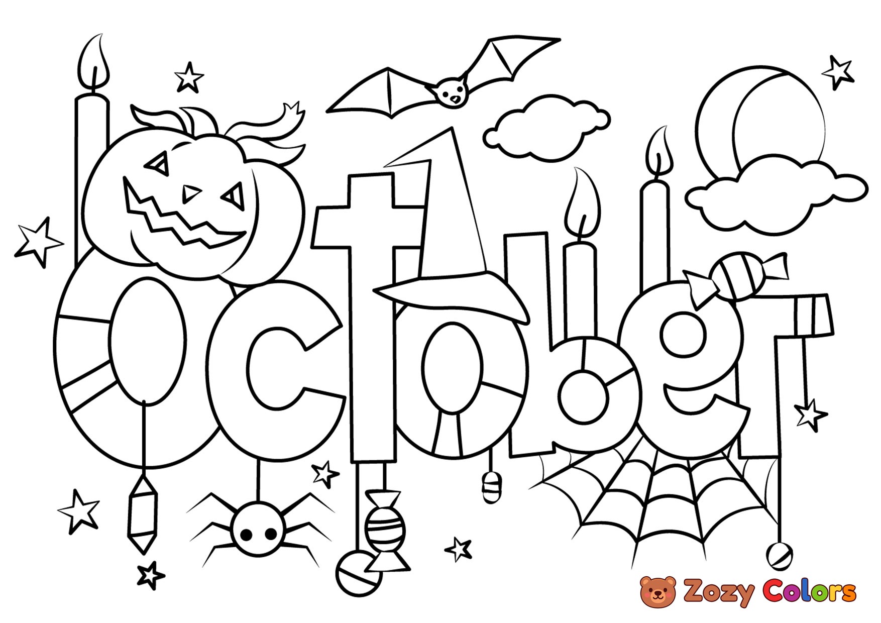 October autumn text sign. Coloring page to print or download and color for your kids.