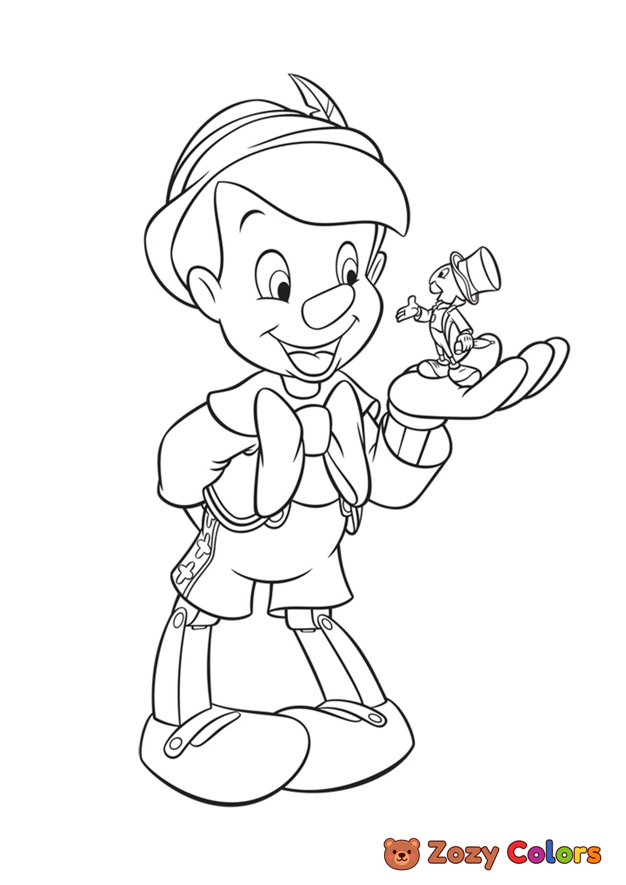 Pinocchio with Jiminy. Coloring page to print or download and color for your kids.