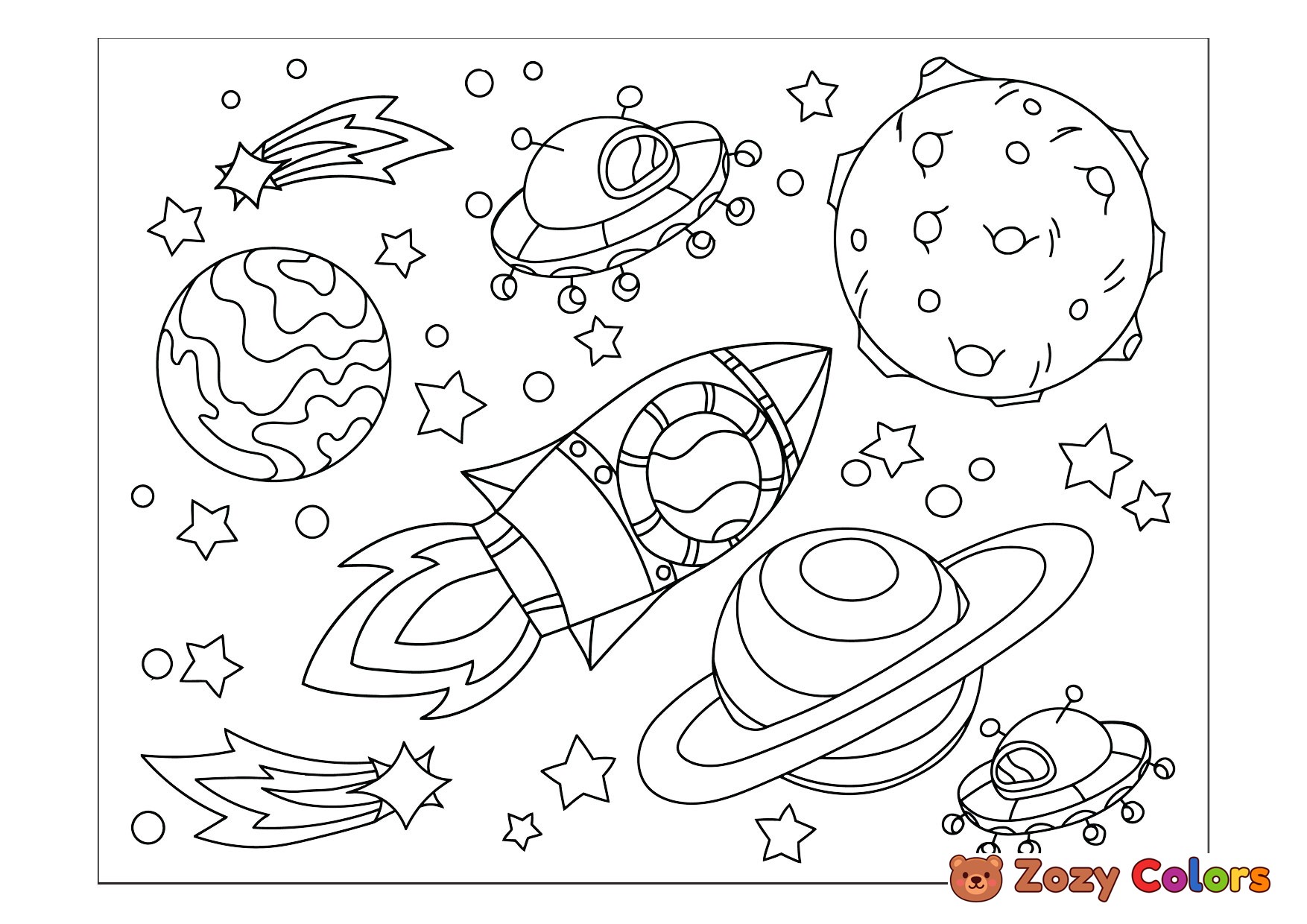 Rocket planet and UFO. Coloring page to print or download and color for your kids.