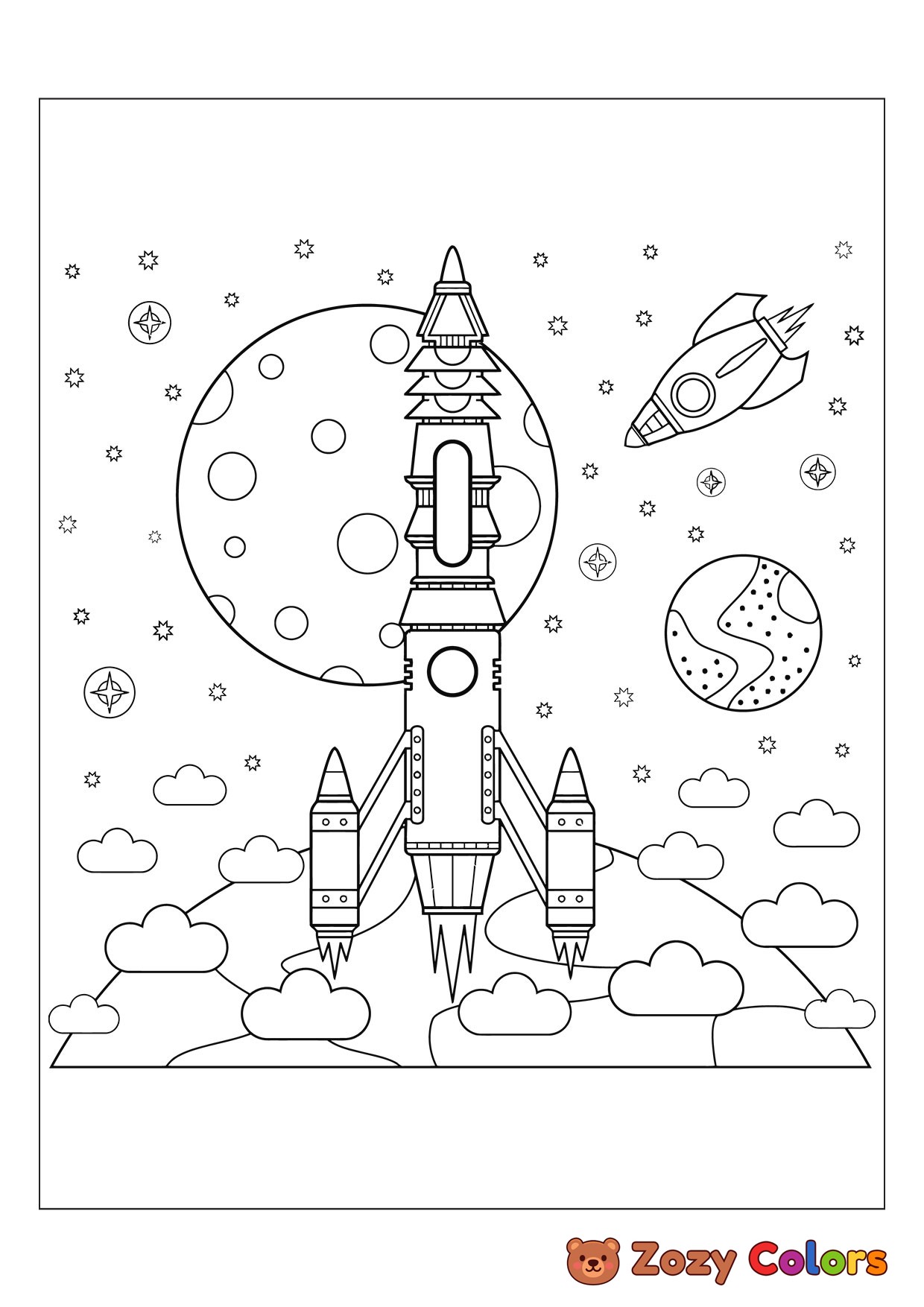 Rocket traveling into space. Coloring page to print or download and color for your kids.