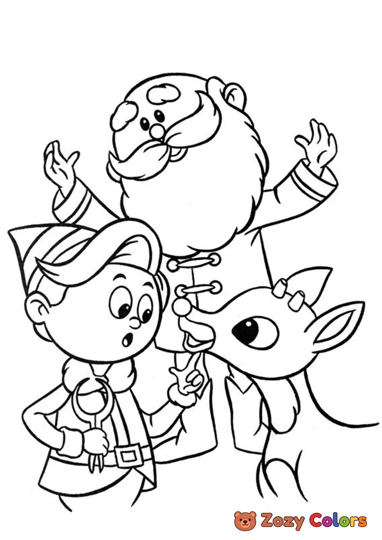 Rudolph the raindeer with Santa. Coloring page to print or download and color for your kids.