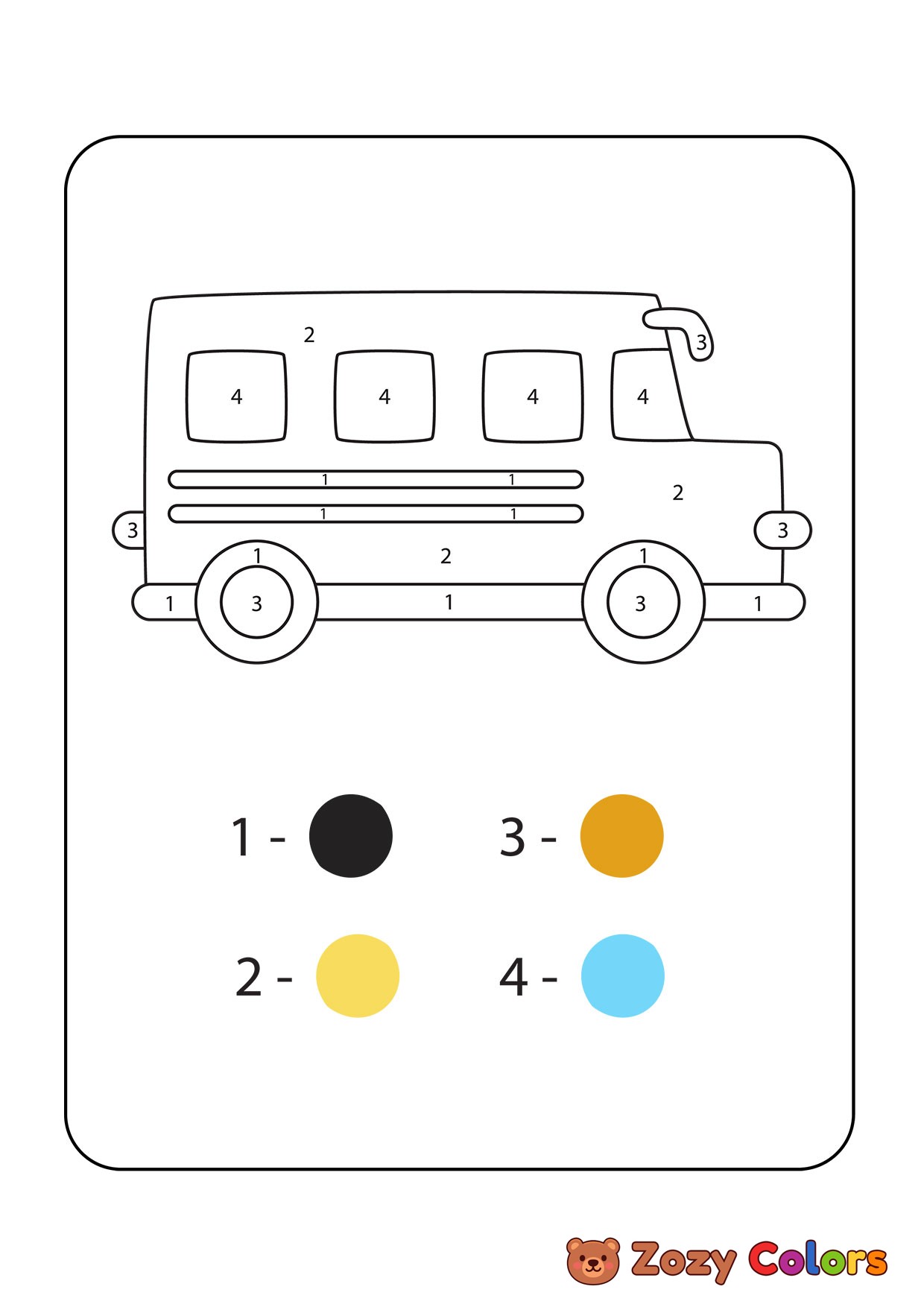 School bus color by numbers. Coloring page to print or download and color for your kids.