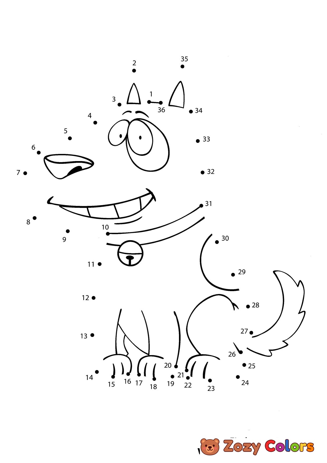 Smiling dog - Free Dot the dots worksheets. Print, connect and color for kids.