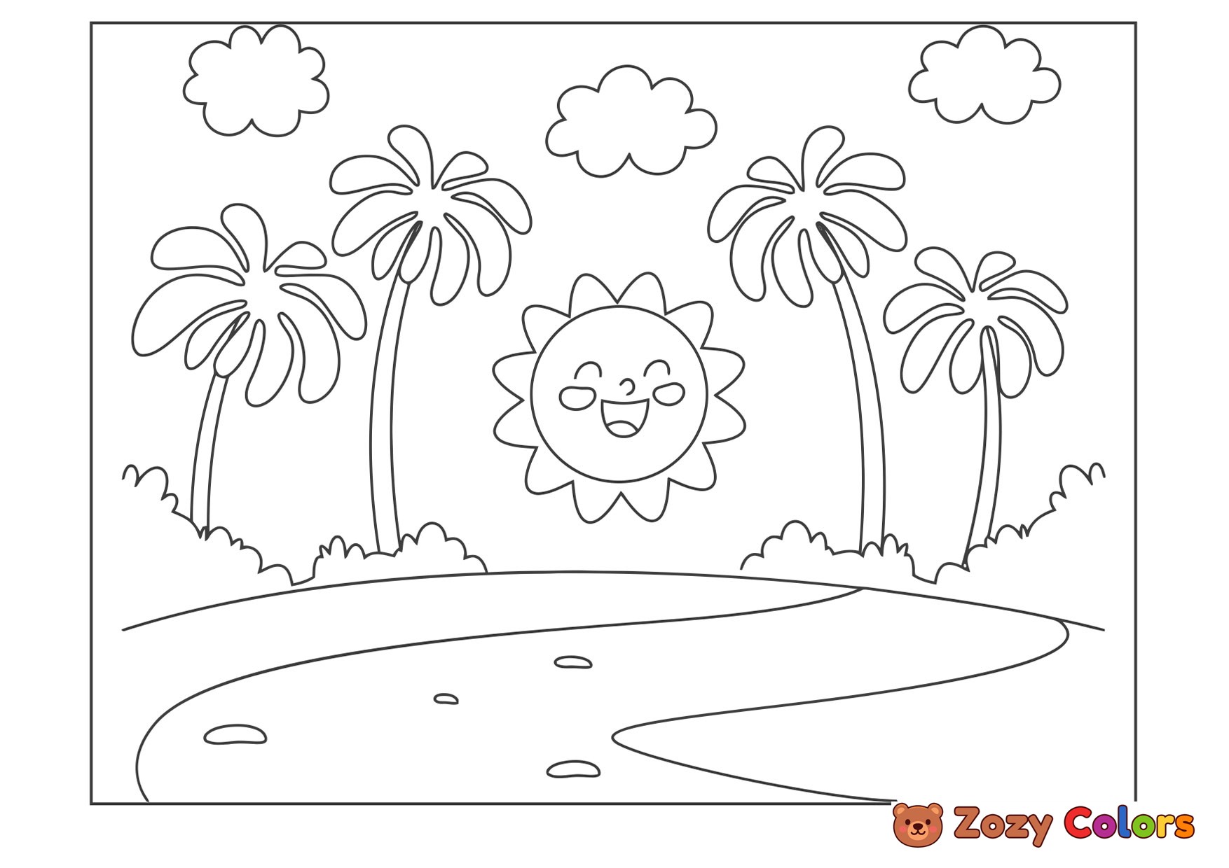 Summer sun and palm trees. Coloring page to print or download and color for your kids.