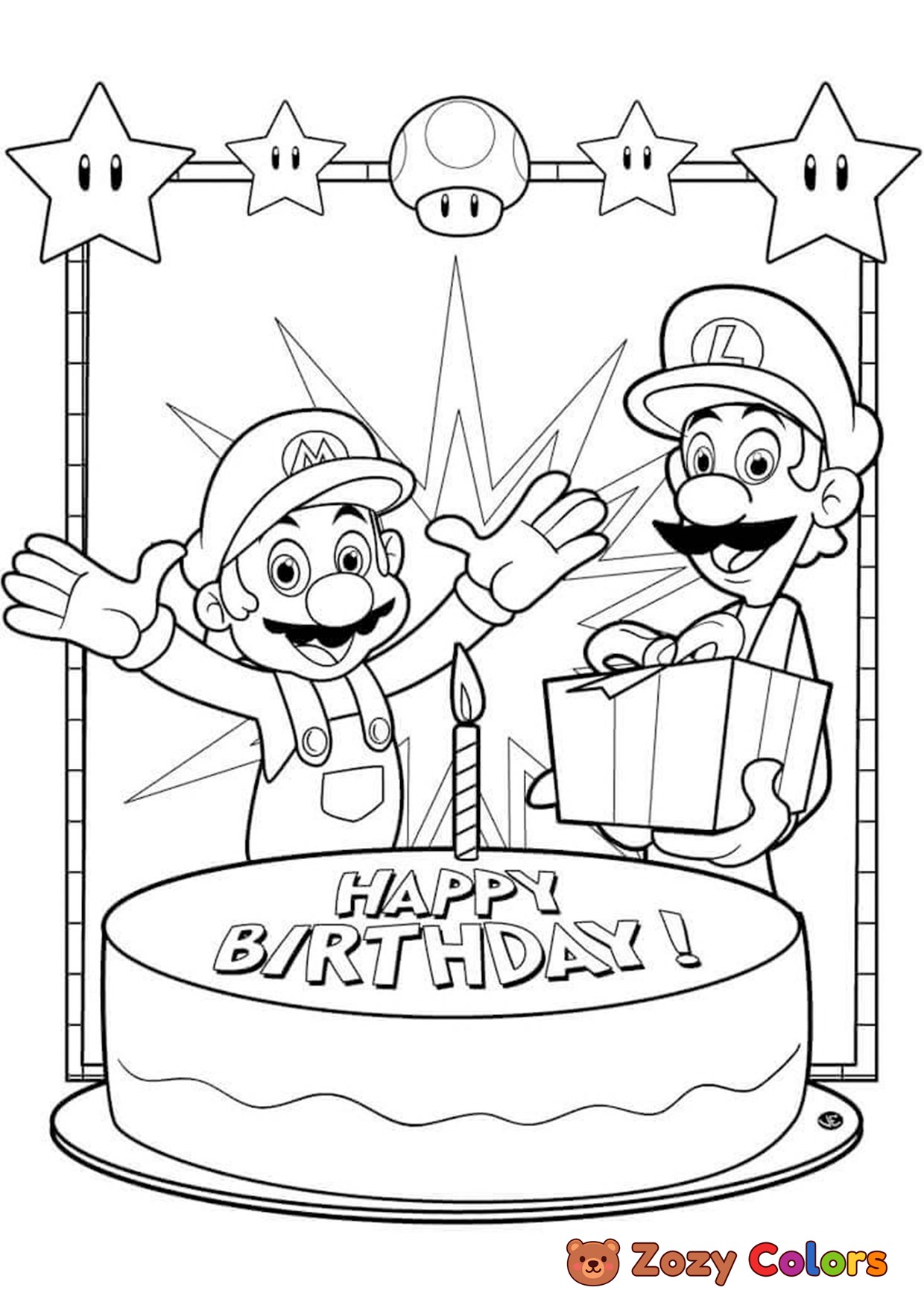 Super Mario birthday party. Coloring page to print or download and color for your kids.