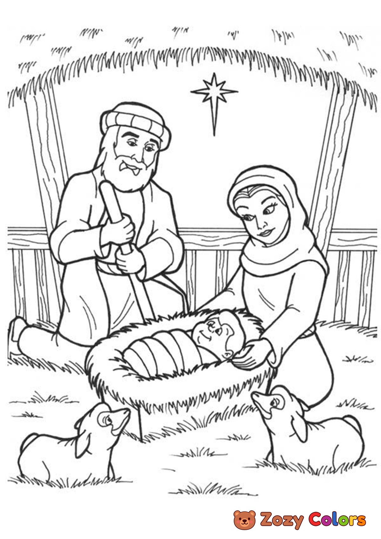 Advent baby Jesus with Mary and Joseph. Coloring page to print or download and color for your kids.