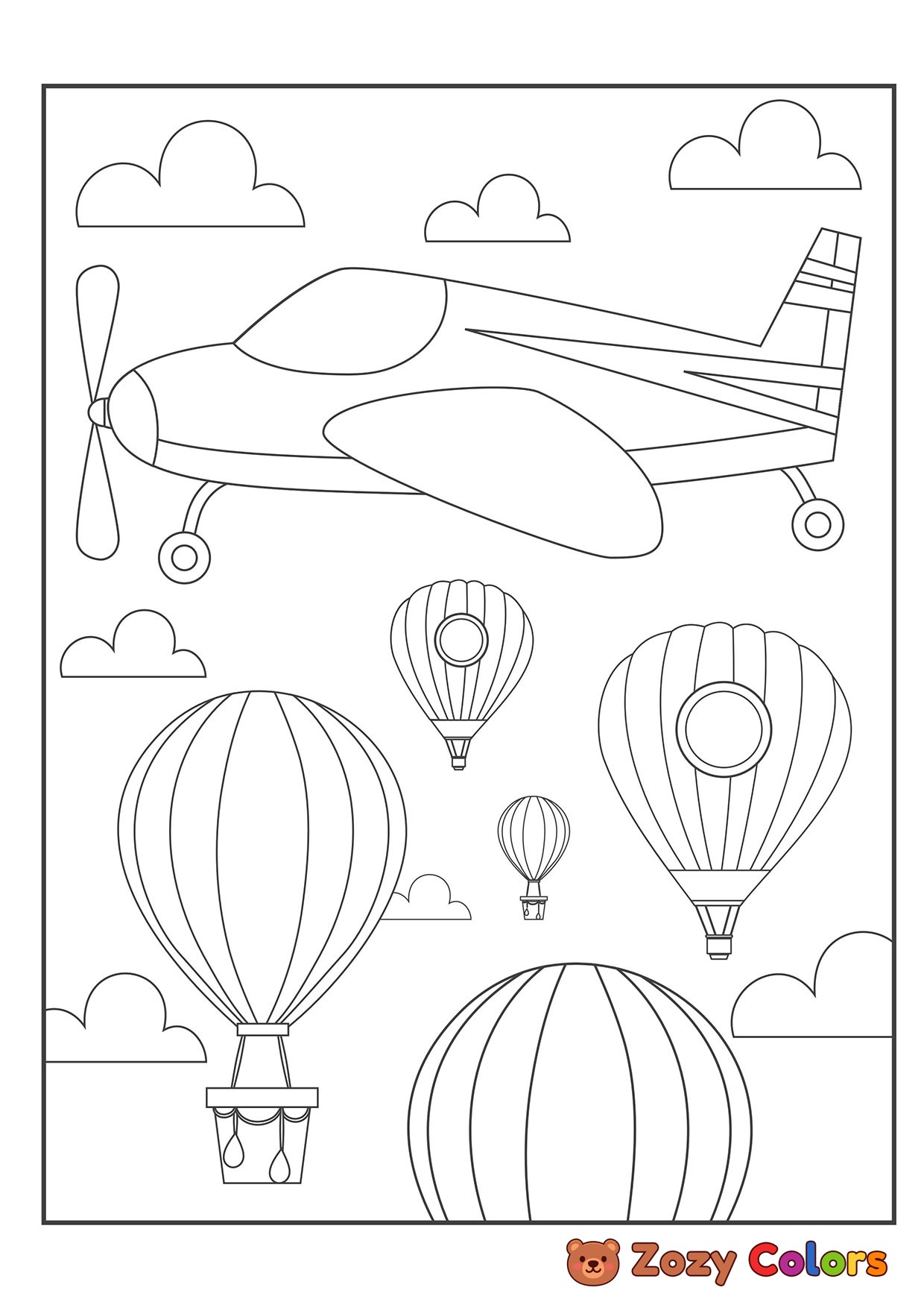 Airplane flying with air balloons. Coloring page to print or download and color for your kids.