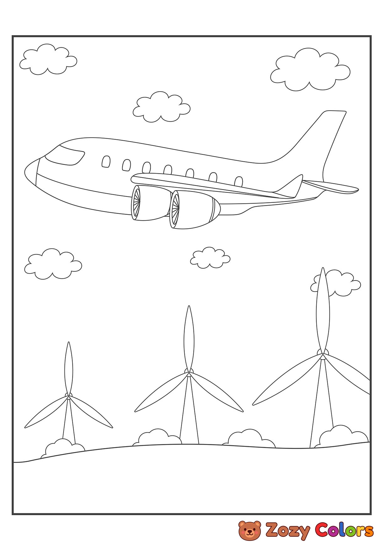 Airplane over the windmills. Coloring page to print or download and color for your kids.