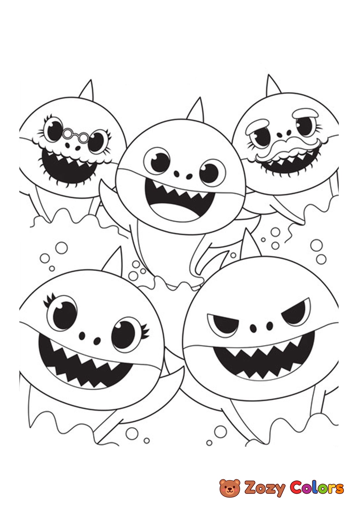 Baby shark all characters. Coloring page to print or download and color for your kids.