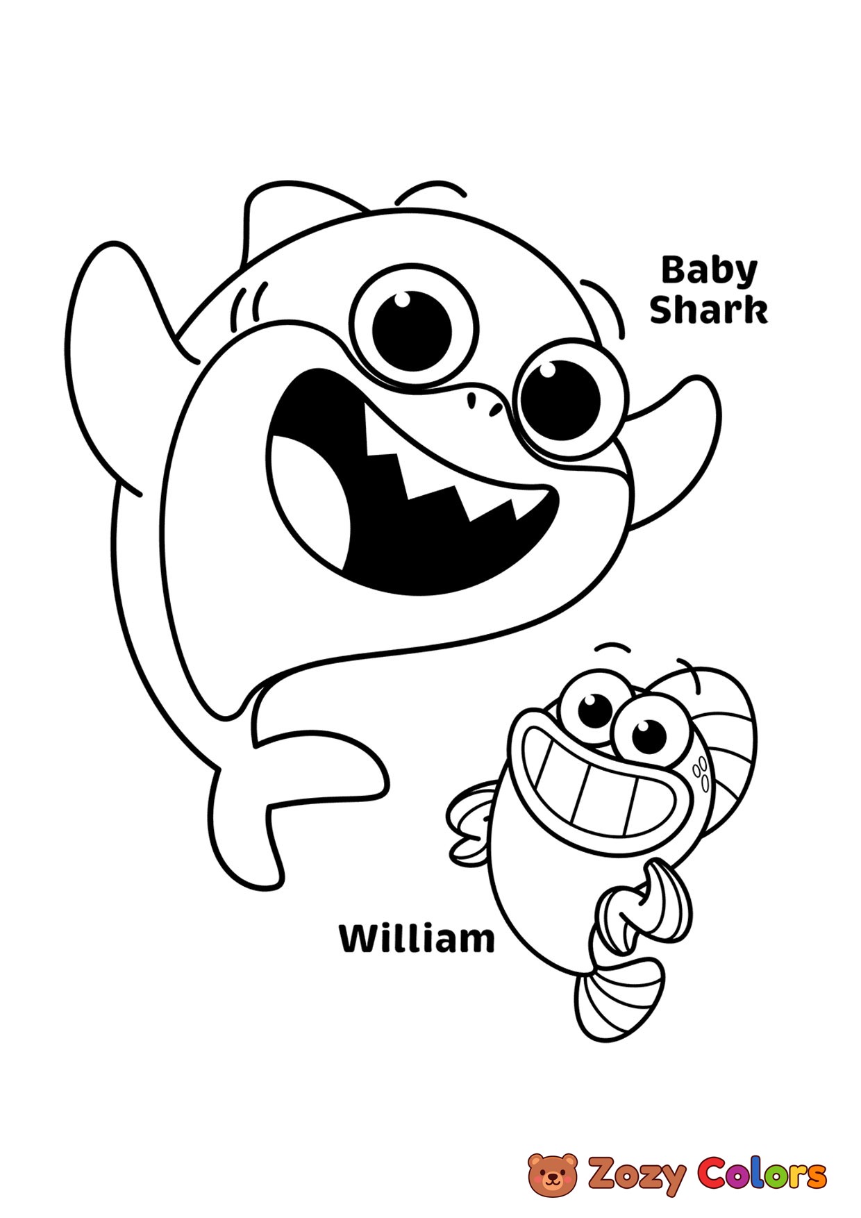 Baby shark with William. Coloring page to print or download and color for your kids.