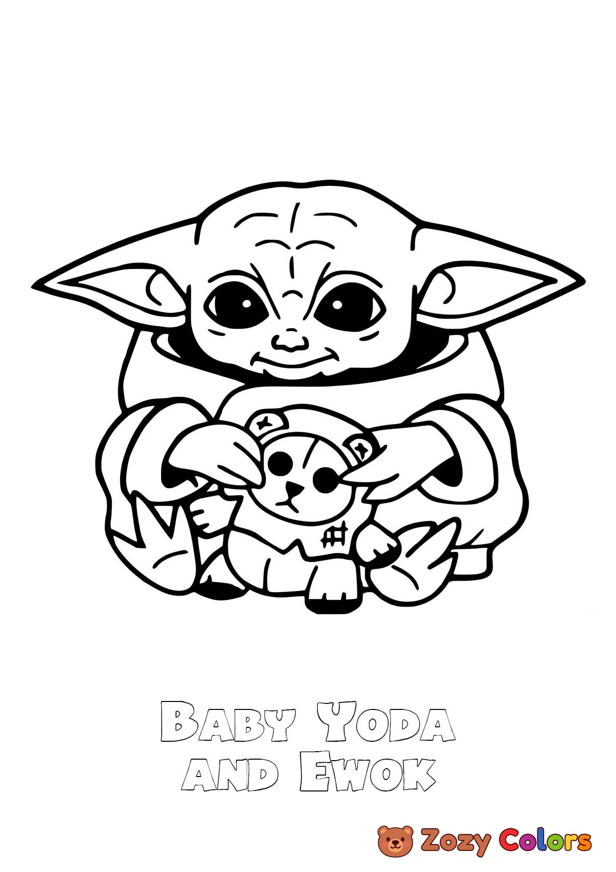 Baby Yoda holding an Ewok. Coloring page to print or download and color for your kids.
