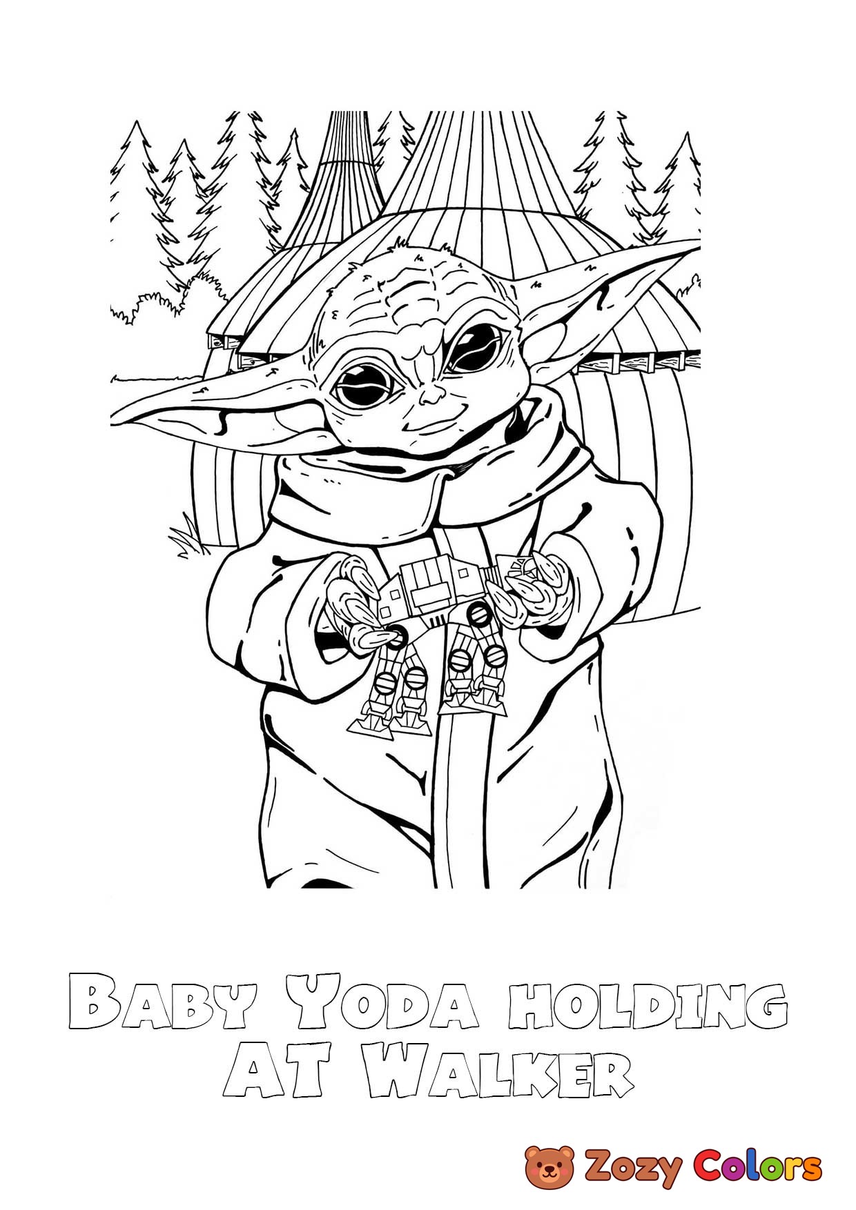 Baby Yoda with a AT AT Walker. Coloring page to print or download and color for your kids.