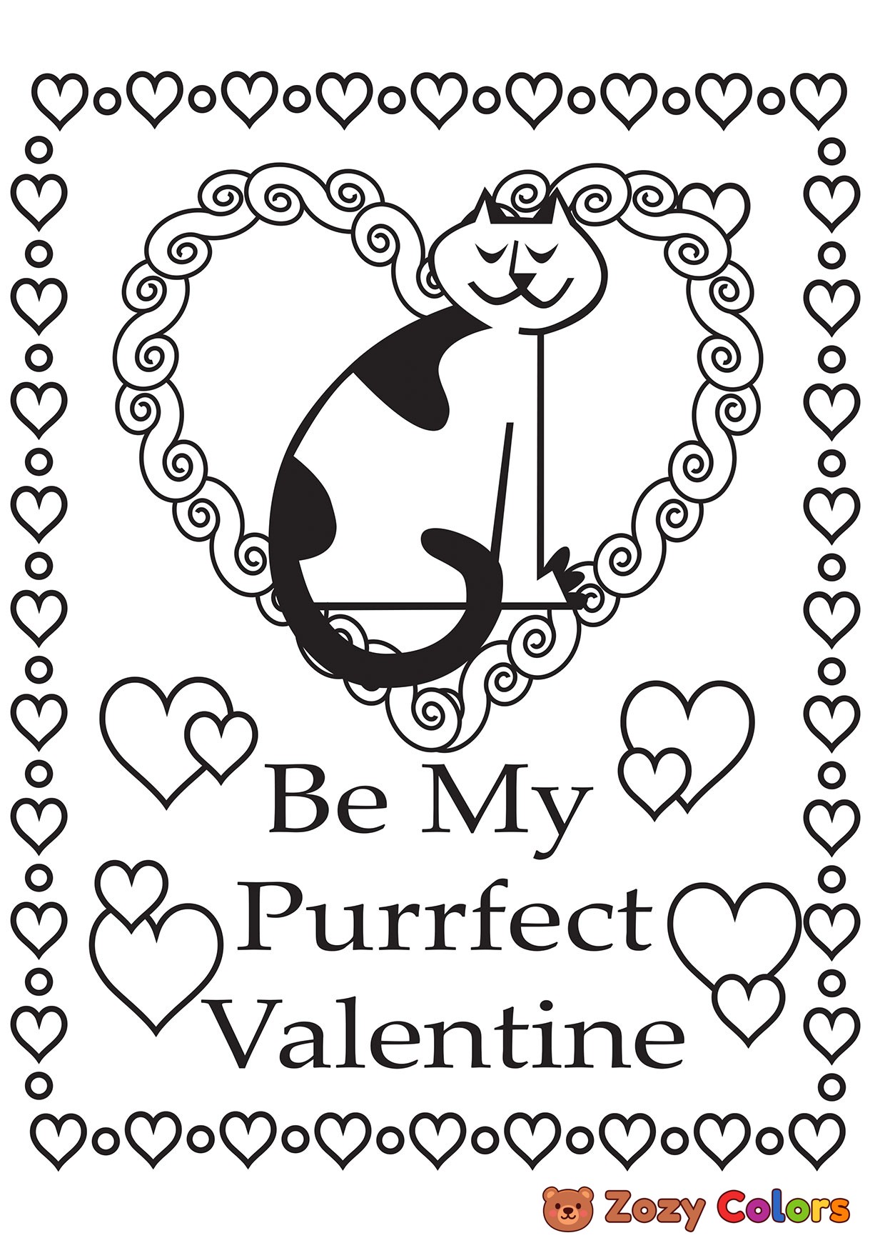 Be My Purrfect Valentines card. Coloring page to print or download and color for your kids.