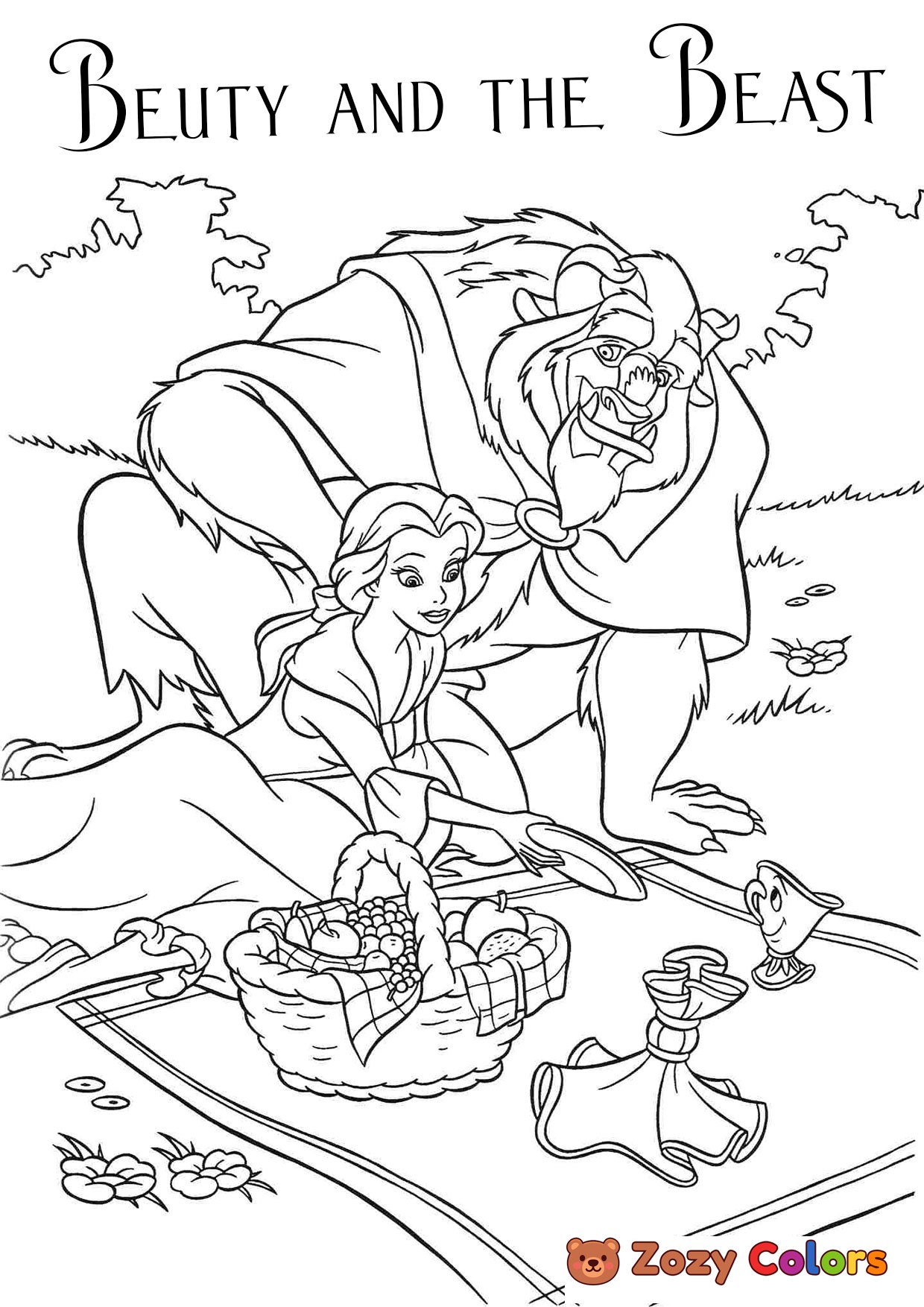 Beauty and the Beast on a picnic. Coloring page to print or download and color for your kids.