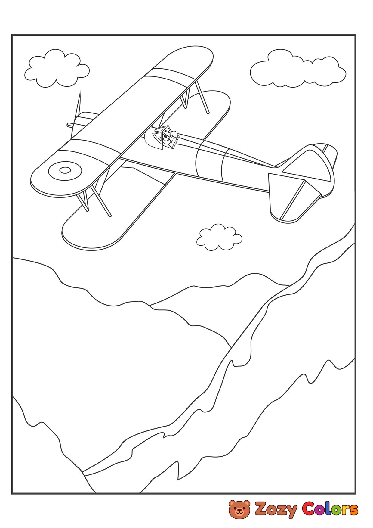 Biplane flying over the mountains. Coloring page to print or download and color for your kids.