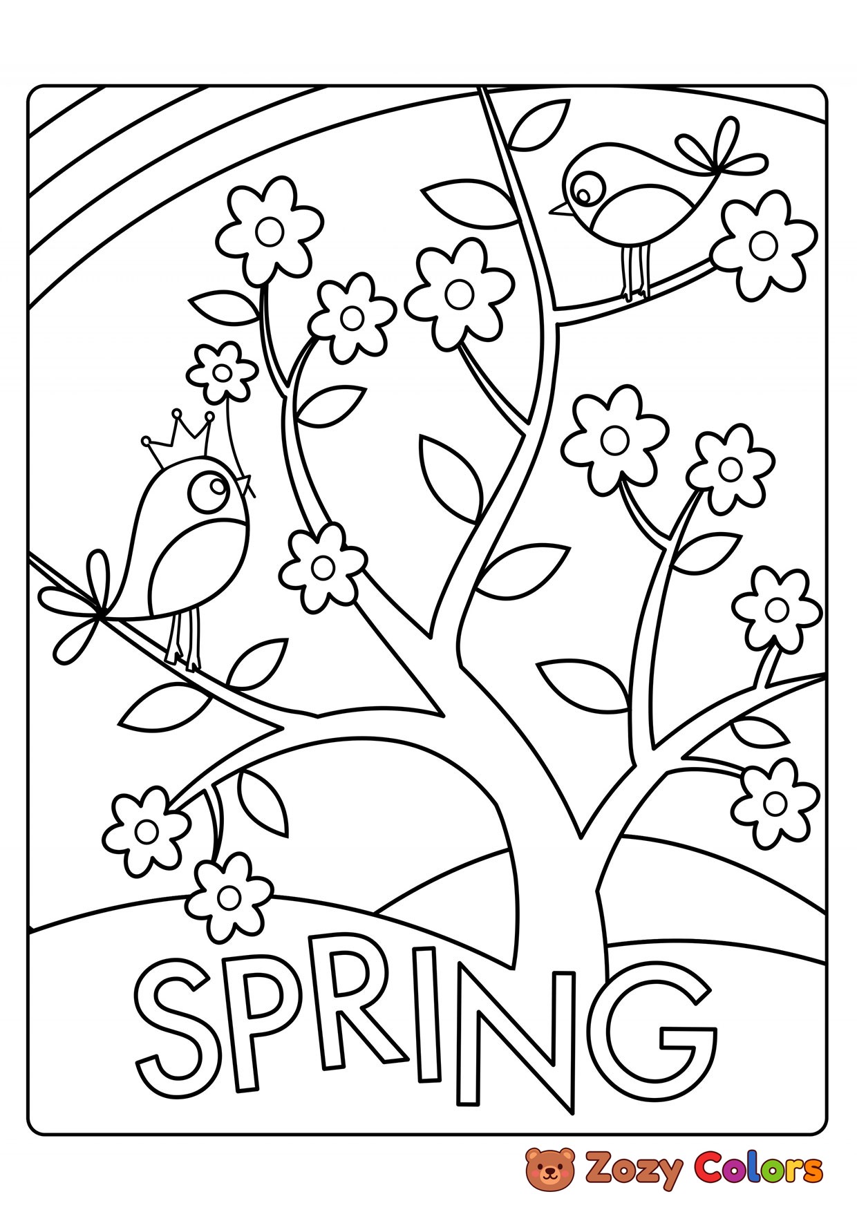 Bird on a tree in spring. Coloring page to print or download and color for your kids.
