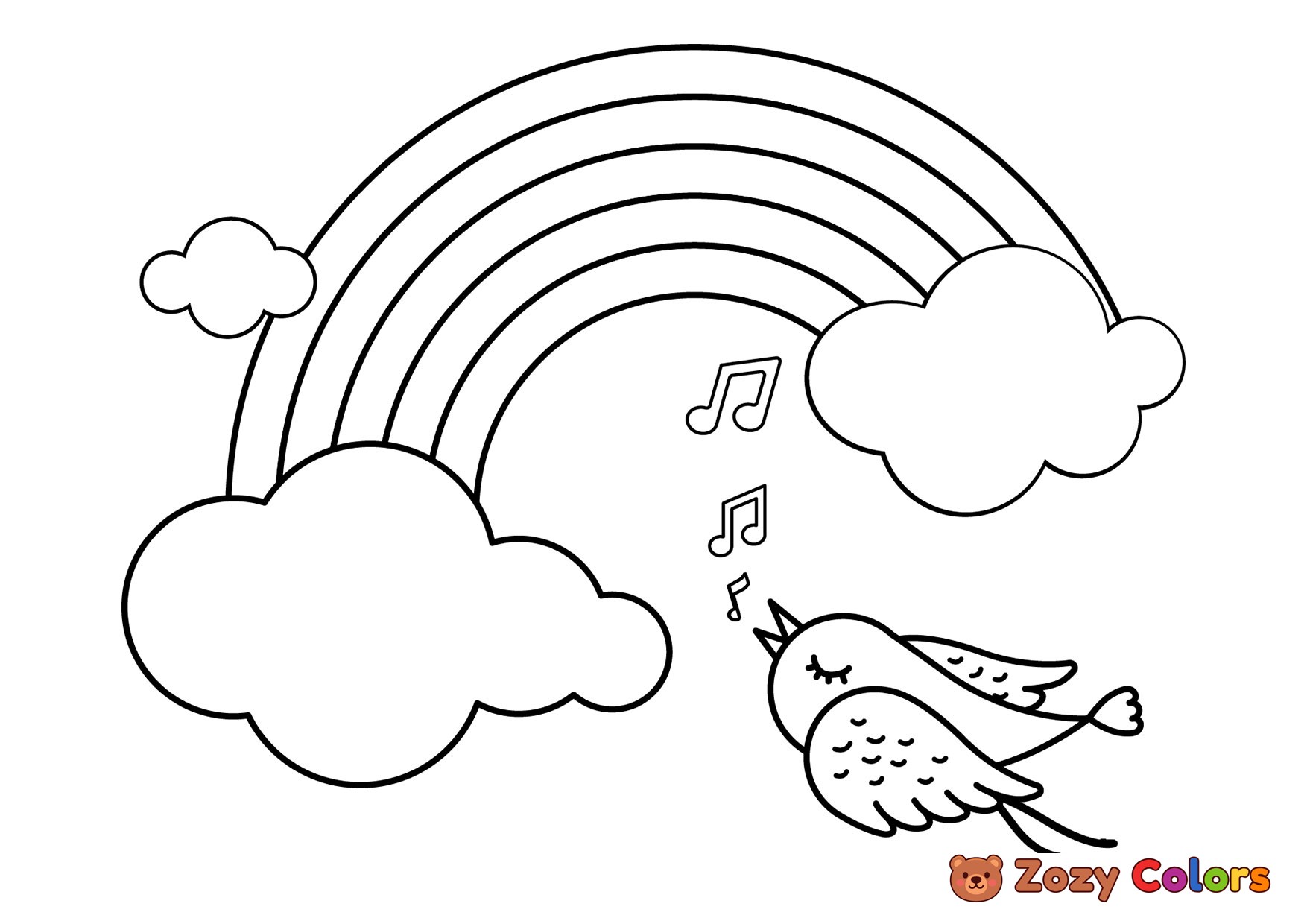 Bird singing to the rainbow. Coloring page to print or download and color for your kids.