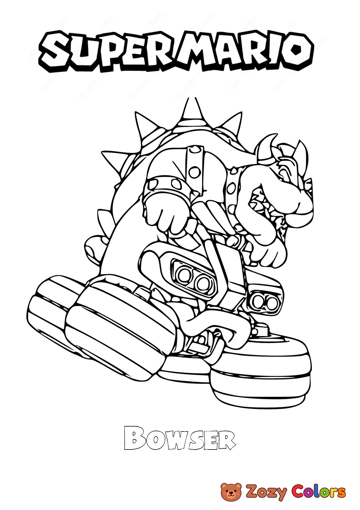 Bowser on a cart. Coloring page to print or download and color for your kids.