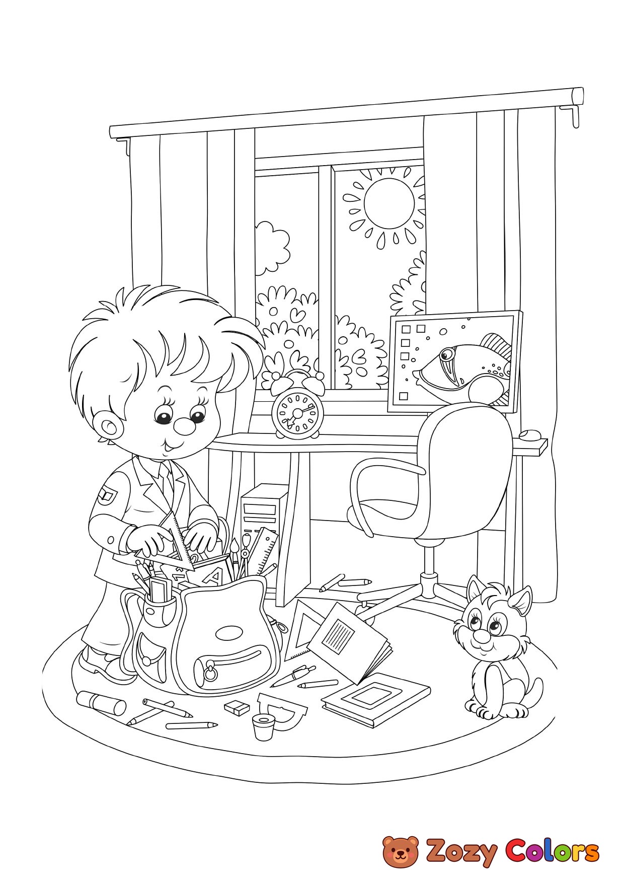 Boy preparing for school. Coloring page to print or download and color for your kids.