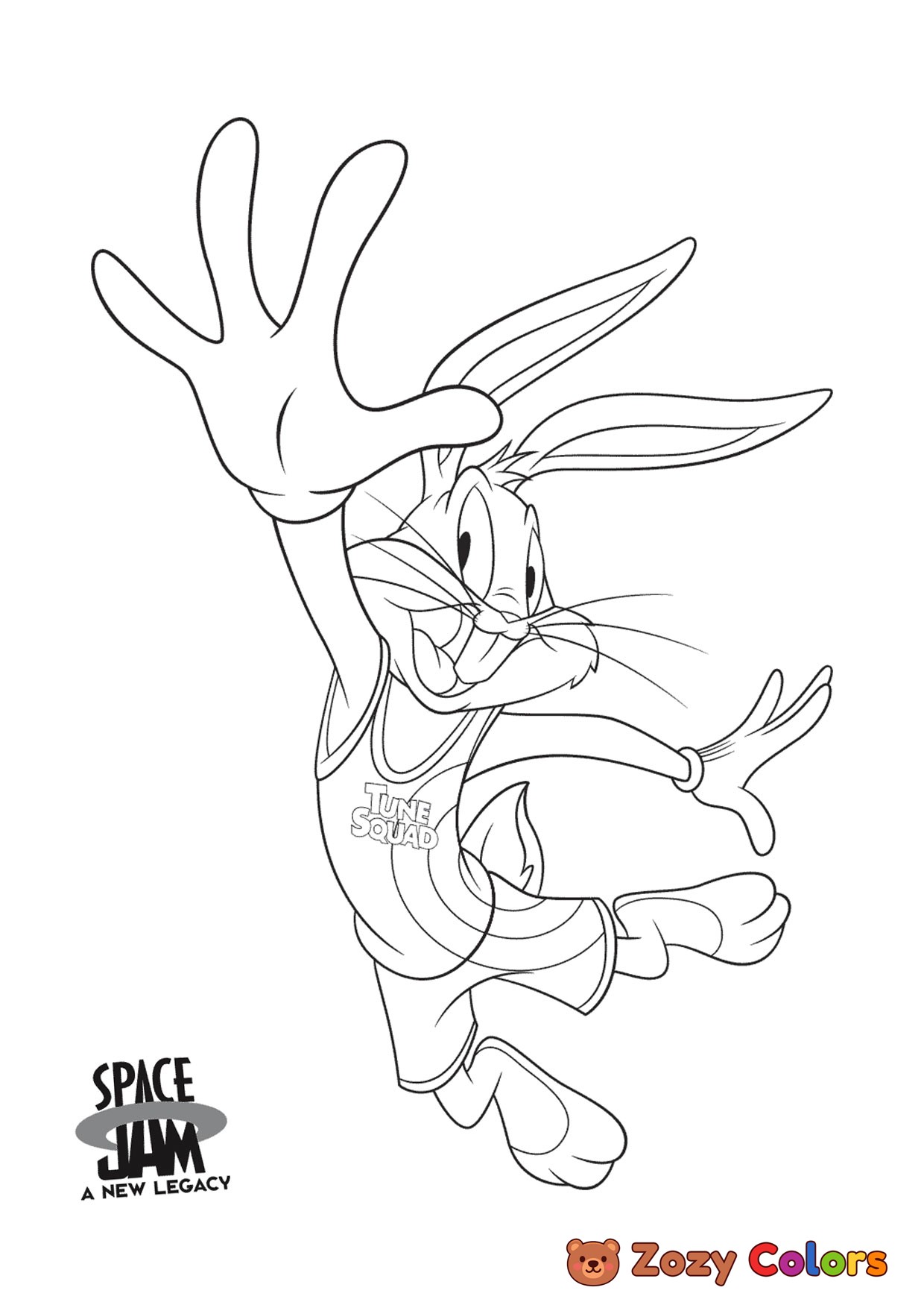 Bugs Bunny jumping with basketball. Coloring page to print or download and color for your kids.