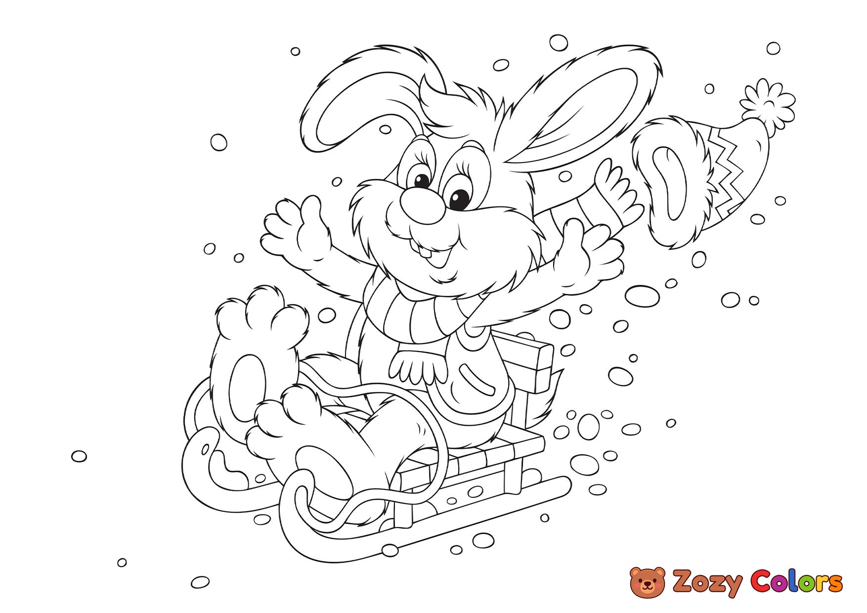 Bunny sledding on snow. Coloring page to print or download and color for your kids.