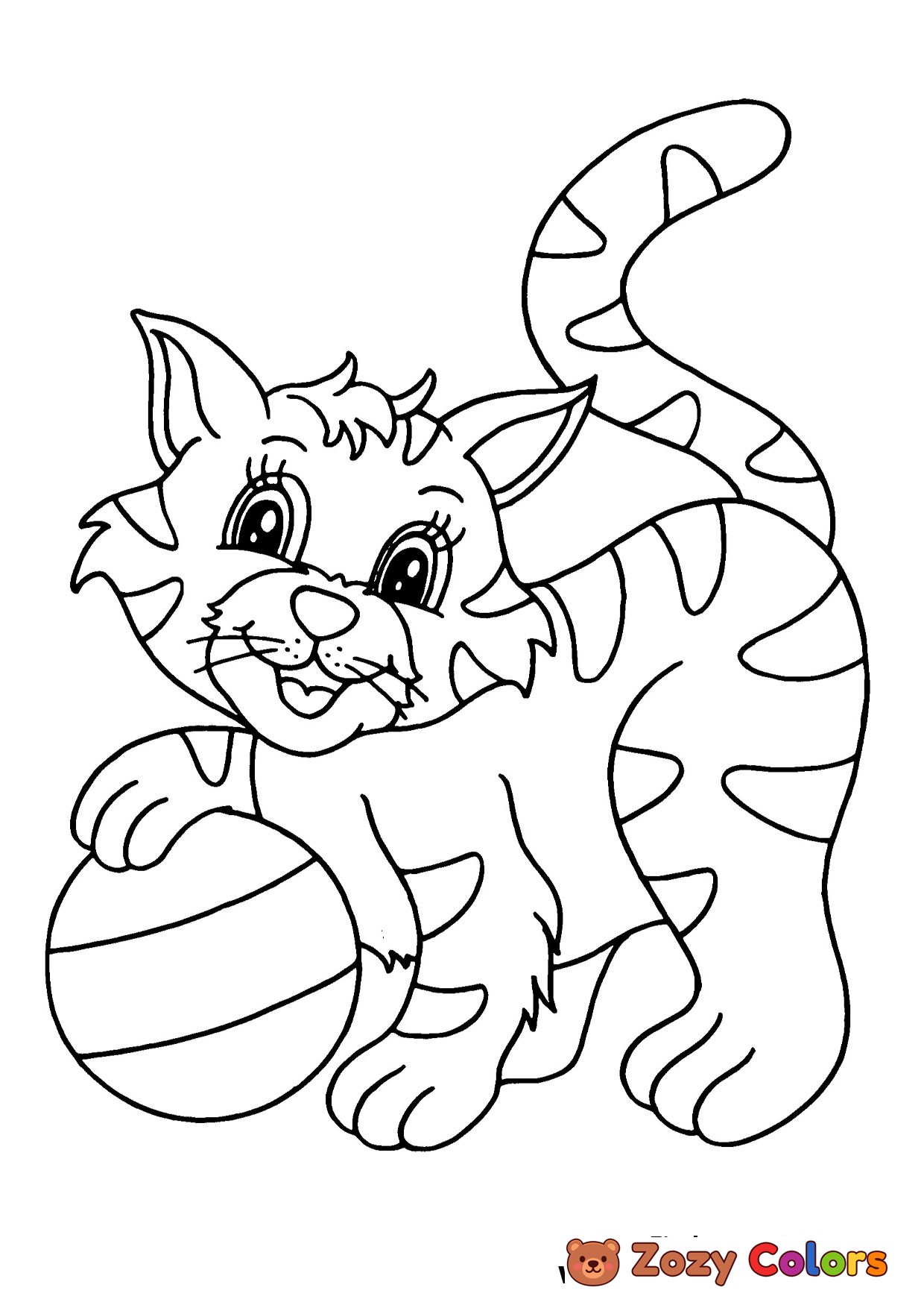 Cat playing with a ball. Coloring page to print or download and color for your kids.