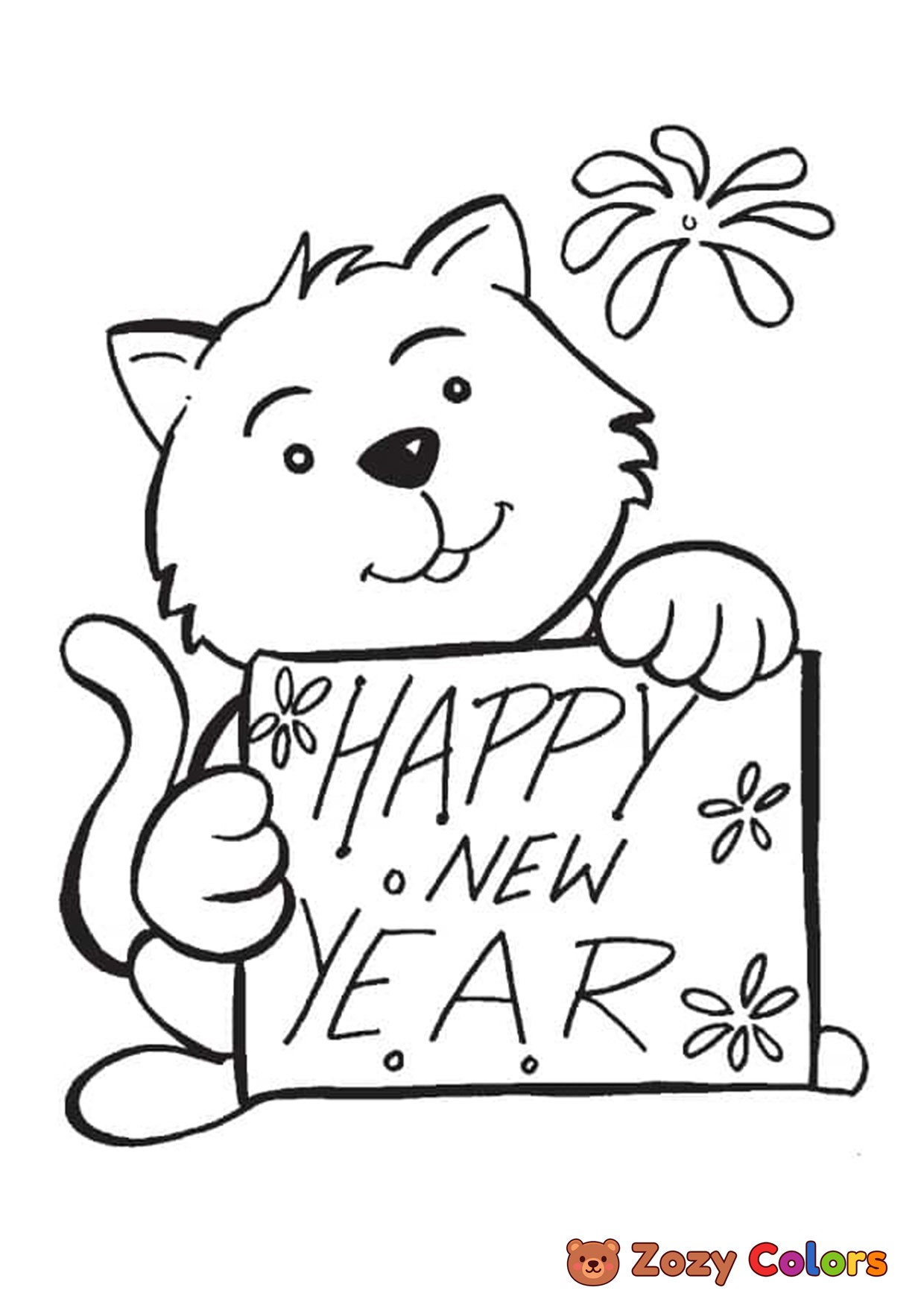 Cat wishing Happy New Year. Coloring page to print or download and color for your kids.