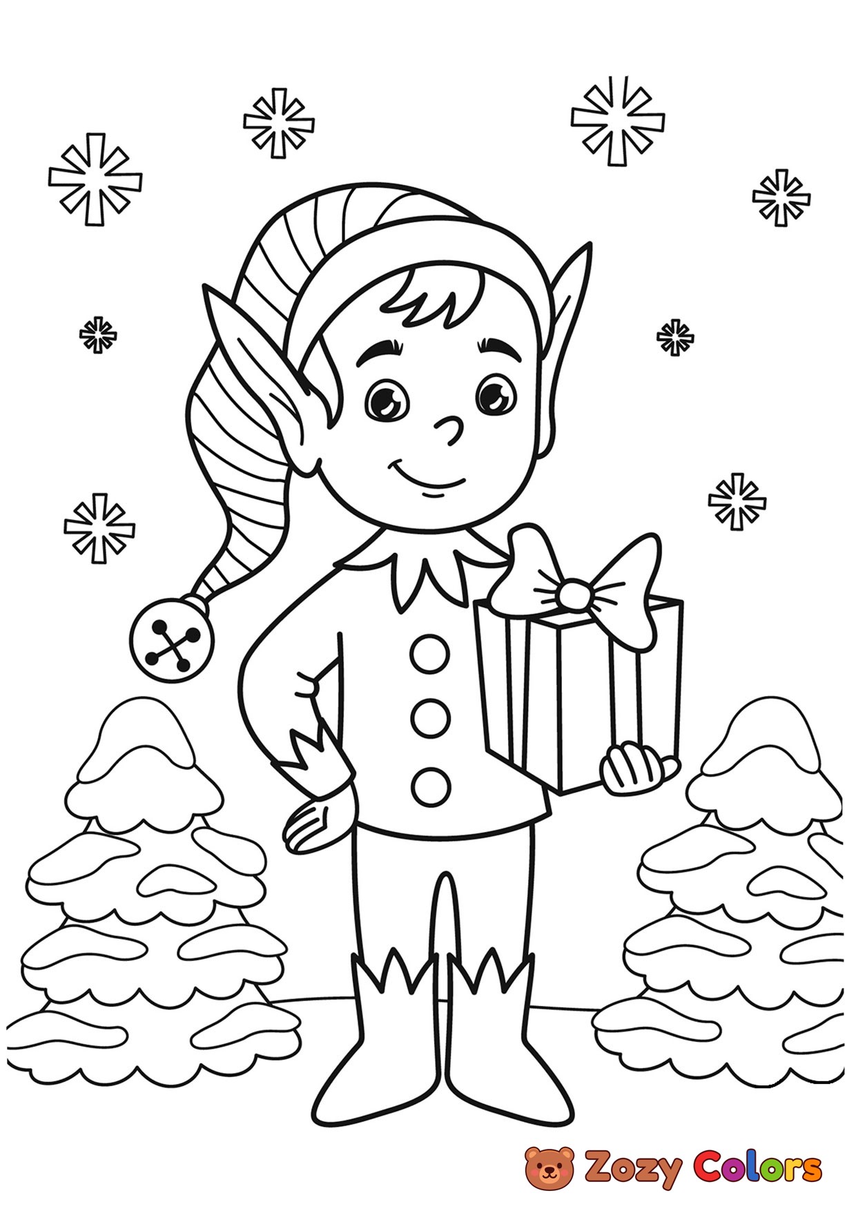 Christmas elf in snow. Coloring page to print or download and color for your kids.